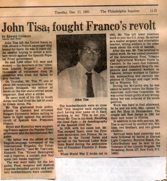 JOHN TISA was born in April 6, 1914 in Philadelphia PA to Sicilian immigrant parents Benedetto and Maria Tisa. The family, which included brothers dominic, charles, and Joseph Tisa, lived at 1040 Reese Street in Philadelphia when the Census was taken in 1920. The Tisas subsequently moved to Camden where in 1930 they lived at 214 Benson Street. He graduated from Camden High School in 1933, where he was known as the class socialist, his ambition then was to travel the world. John Tisa was a member of the Young People's Socialist League, the Socialist Party and various other socialist and communist movements. He was a union organizer at the Campbell Soup Company and took part in the abortive strike of 1934. John Tisa studied at Brookwood Labor College and the Charles Morris Price School of Journalism in Philadelphia. In 1936 he took a job with the WPA but continued his union activities at Campbell's Soup. In November of 1936 he was sent as a delegate to the American Federation of Labor National Convention in Tampa FL. It was here that he heard about the struggle of the Republicans in the war against the Fascists in Spain. John Tisa left for Spain in January of 1937 to join the American Lincoln Brigade. He fought at the battle of Jarama and later became the editor of Volunteer for Liberty , the official English-language brigade publication. At the defeat of the Republicans, he remained in Barcelona to help collect documentation on the International Brigades. He continued his documentation efforts in Paris, returning to Camden in 1939. Upon his return, John Tisa renewed his efforts to organize workers at the Campbell Soup plants and help organize and win the first union contract for Local 80, United Cannery, Agricultural, Packing and Allied Workers of America, UCAPAWA-CIO. He next went to Chicago to help organize a similar plant, then returned to Camden to help organize unions at the La Palina Factory of the Consolidated Cigar Company, the Siegel Cigar Company, the Knox Gelatine Company, and tobacco companies in Trenton, Philadelphia, Charleston SC, and the middle west. He served from 1942 through 1945 in the armed services. Because of his service in the Lincoln Brigade and membership in Communist and Socialist organizations, he was refused promotion and overseas service. After the war, he returned to union organizing and was elected president of the Food, Tobacco, Agricultural, and Allied Workers Union of America (FTA) local in Chicago (formerly the UCAPAWA). During the 1940s and 1950s he continued his work in the trade union movement and helped organize leaf tobacco workers in the South and fruit and vegetable packers in California. At the CIO convention in December 1948, CIO President Philip Murray charged that the FTA consistently supported Communist Party interests rather than those of the CIO. Although John Tisa and other union officers filed a non-Communist affidavit in August of 1949, the FTA was expelled from the CIO in December of that year. The remnants of the union merged with the Distributive Processing and Office Workers of America, an amalgamation of several Communist-dominated unions expelled from the CIO. In 1952 John Tisa was called to testify before the House Un-American Activities Committee but refused to answer any of the question put to him. Finally forced out of his union position, he opened a pet shop in Merchantville which later moved to a location on Route 38 west of Mansion Avenue in Pennsauken NJ. In 1981 he moved to Florida with his wife May, where he resided until his death on December 12, 1991. During his time in Spain, John Tisa kept a diary to contribute to the Republican forces' program of tactical documentation of analysis. After retiring to Florida, John Tisa wrote Recalling the Good Fight . an account of his time in Spain. He described the training, or lack of it, of new recruits and recalled his experiences in battle and as historian and editor attached to the International Brigades headquarters. The book was published in 1985. He also edited a collection of propaganda posters, The Palette and the Flame : Posters of the Spanish Civil War. John Tisa also donated a collection of pamphlets, books, and periodicals relating to his Spanish Civil War and trade union experiences to the Rutgers-Camden Library. These items are now housed at the Camden County Historical Society in Camden NJ. Antoinette Tisa, the wife of his brother Dominic, was well known in Philadelphia, Camden, and South Jersey as an opera singer during a career that ran from the 1940s through the 1960s. Dominic Tisa owned and operated the London Barber Shop on South 3rd Street in the 1940s and 1950s. |