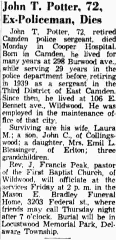 HERE IN NUMBERS QUIZ Arrests in the numbers racket in Camden continued today simultaneously with the continuation of the inquiry into the murder of City Detective William T. Feitz Jr. With the Feitz slaying probe in its eleventh day- the detective was slain September 2 at 243 Sycamore Street, an alleged disorderly house- city and county authorities were still questioning witnesses in an endeavor to obtain sufficient evidence to name the murderer or murderers. The arrest this morning of Crawford Smith, 51, of 702 Carman Street, as a numbers writer, brought the total of those apprehended this week in the numbers racket to 10. At the same time Police Judge J. Harry Switzer held Fred Klosterman, 33, of 1050 Mechanic Street, in $5000 bail for the grand jury on a charge of operating a numbers game. Klosterman's brother, Joseph Klosterman, 35, of 1400 Mechanic Street, was released in $3000 bail yesterday by Judge Switzer on a charge of operating a numbers lottery. The Klostermans. according to police, are among the topnotch numbers barons of the city. Both pleaded not guilty to the charges against them. No Testimony Taken Fred Klosterman surrendered voluntarily yesterday afternoon when he learned that police were seeking him as an alleged numbers operator. He was arraigned in police court today on complaint of George Zeitz, a city detective, who charged him with operating a numbers game. Police did not reveal where Fred Klosterman allegedly operated. There was no testimony taken at the hearing of Fred Klosterman. His bail bond was signed by John Zubien. Police say they do not know Zubien's address. Mrs. Anna Bubnoski, of 1426 Mount Ephraim Avenue, posted the $3000 bail for Joseph Klosterman. Zeitz also had made complaint against him. Fred Klosterman surrendered yesterday, according to police, after a defendant in police court testified that he was employed at an alleged numbers bank operated by Fred Klosterman. Zeitz swore to a warrant for Fred Klosterman's arrest based on the police information, he said. Hearing Tomorrow Smith, who was arrested by George Clayton, a policeman, will be given a hearing in police court tomorrow as an alleged numbers writer. Meanwhile no disposition was made in the case of Mrs. Mollie Schwartz, 42, who was arrested yesterday on a charge of operating a still at a double dwelling at 3404 Rosedale Avenue. Police Lieutenant John Potter said the woman admitted operating the still. A man said to be a brother of Mrs. Schwartz fled in his undershirt at the time of the raid, as Sergeant Edward Hahn and Policeman Joseph Keefe were making the arrest and seizure. The seizure included 13 barrels of alleged mash, a stove, one cooler, three gallons of liquor, and a 75 gallon still. Police reported that one of two cars without license tags which had been parked in front of the house disappeared later. Cops to Aid State Strict cooperation with the State Alcoholic beverages Commission in the detection, closing up, and prosecution of speakeasies is being given by the Camden Police Department. That statement was made today by Mayor Roy R. Stewart, who is the director of the department of public safety, and came as a result of an interview which Howard B. Dyer, an investigator with the state beverage commission had with the mayor. Dyer was formerly deputy city clerk. "Dyer came in and asked for the cooperation of the police department," said Mayor Stewart, "and I told him we would cooperate fully". The state alcoholic beverage commission, through its investigators, has been busy in running down speakeasies, stills and other illicit liquor practices. |
