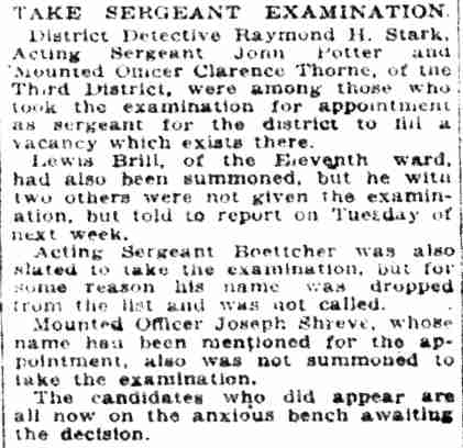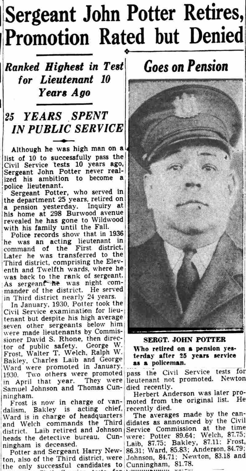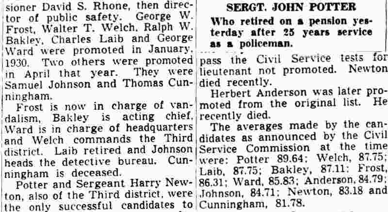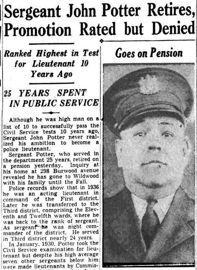 ILLNESS CAUSES SHIFTS FOR POLICE OFFICIALS Temporary changes in the police department to offset the absence of Lieutenant George Frost, head of the First District, who is ill, and Lieutenant George Ward, of headquarters, who is away on police business, were announced yesterday by Chief Arthur Colsey. Sgt. John Potter, of the Third District, is made acting lieutenant and placed in charge of the First. Patrolman Louis Schmidt, of the Third, replaces Potter as acting sergeant. Lieutenant Herbert Anderson, of the Fourth District, replaces Ward at headquarters, with Sgt. John Skolski acting as lieutenant in charge of the Fourth. Sgt. Gustav Koerner, of the Second District, who has been working in plain clothes, is to report in uniform. Patrolman John Kowal, of the Second District, is shifted to the First district, with Patrolman William Schultz going from the First district to the Second district. |
