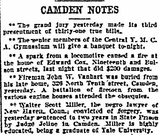 JOHN W. VANHART was born in March 1864 in New Jersey to Charles P. and Hannah "Ann" Vanhart. The family, which included younger sister Anna, lived at 427 Spruce Street when the Census was taken in 1880. Charles Vanhart was then working as a laborer, young John had already began working as a paperhanger, a trade he would follow until his appointment to the Camden Fire Department in 1899. The elder Vanhart soon went into business as a milk dealer. The family remained at 427 Spruce Street through 1882. The 1883-1884 Directories show the Vanharts at 511 Spruce Street. The family had moved to 580 Mt. Vernon Street by the time the 1884-1885 City Directory was compiled. Charles Vanhart had by then gone into business operating a grocery. The 1887-1888 and 1888-1889 City Directories lists John Vanhart living with his parents at 580 mt. vernon street . His father was still in the grocery business at that address. John Vanhart married his Ireland-born wife Ella around 1890. 1893-1894 City Directory shows John Vanhart at 1030 Line Street. The 1894-1895 and 1895-1896 City Directories reveal the Vanhart family at 1019 Penn Street by 1906. . The 1896 City Directory lists the Vanhart family at 1022 Linden Street. The 1898 Directory shows them at 314 North 10th Street, while the 1899 Directory gives an address of 316 North 10th Street, consistent with the 1900 Census. John Vanhart was appointed to the Camden Fire Department on November 23, 1899. According to the 1900 Census John and Ella Vanhart had two children born prior to 1900, sadly, only daughter Mary E. Vanhart was alive at the time of the census. He then made his home at 316 North 10th Street in what was then Camden's Second Ward. Not long afterward the family moved to 326 North 10th Street . John Vanhart died on April 23, 1903 and was buried at Evergreen Cemetery. His widow, Ella, had moved to 1005 Penn Street by 1906. |