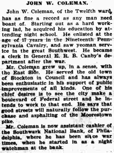 Vets in Colorful Memorial Crowd Convention Hall More than 2500 persons attended a joint veterans memorial observance in Convention Hall which followed a parade of veterans and civic organizations yesterday afternoon. To the martial strains of bands and bugle corps, the participants marched from Fifth and Cooper to Seventh Street; south to Haddon Avenue, then to Line Street and the Convention Hall. The parade was headed by a squad of motorcycle police under Acting Sergeant William Taylor. They were followed by the band, headquarters, howitzer, medical and service companies of the 114th Infantry in command of Capt. Mahlon F. Ivins, Jr. Then came the massed colors, National Guard, Naval Reserve, Disabled American Veterans, John J. Pershing Camp No.9, United War Veterans; Gen. John A. Mather Post No. 18, Spanish War Veterans with their fife and drum corps and the Clara E. Waller Auxiliary; Posts 518 and 980 of the Veterans of Foreign Wars and their bugle corps; Mt. Ephraim Junior Legion, No. 150; and, bugle corps; Public Service American Legion Post and bugle corps; Westmont American Legion Post and bugle corps; 50 Pennsylvania Gold Star Mothers led by Mrs. Mary E. Hewson; Elks color guard and the Salvation Army and band. G. A. R. Vets In Line Three veterans of the G. A. R., in flag-draped automobiles, participated in the parade. They were John W. Coleman, 76, of 31 North Thirty-fifth street, who served with the 19th Pennsylvania Cavalry; William A. Morgan, 93, of Clementon, who was with the 104th Doylestown Infantry, and Leonard L. Roray, 89, of Glassboro, who served with Company H, Third New Jersey Cavalry. Ceremonies at Convention Hall opened with advance of the colors to the stage and invocation by Rabbi Nachmann Arnoff. Rev. Charles Bratten Du Bell, former chaplain of the 114th Infantry, delivered a memorial address, taking as his subject the career of General "Stonewall" Jackson. Congressman Charles A. Wolverton after paying tribute to the G. A. R., Spanish American and World War veterans, promised that Congress would make provisions to support widows and orphans of veterans who need aid before adjournment this Summer. Criticizes Veteran Cuts He attacked any plan for balancing the national budget which does so at the expense of the veterans. "There are two ways to balance the budget,'" he said. "One is to take the money from the veterans and federal employees. The other is to require wealth to help." American Legion, Veterans of Foreign Wars and United Spanish War Veterans memorial services and rituals also featured the program. Rev. Lewis A. Hayes, of Westmont, pronounced the benediction. C. Richard Allen, past county commander of the American Legion, was master of ceremonies. The committee included Samuel Magill, Jr., chairman; Edward A. Stark, A. F. Klein, Joseph A. Kohler, Joseph Whylings, James J. Burke, Norval McHenry, Charles Buzine, William Amberg, James Milne, William P. Breen, William Miller, William Reinholdt; Edward J. Wintering, William Eisele, William Lloyd, Joseph F. Markley, Frank Ellis, D. J. Connors, Joseph Lounsberry and Charles M. Jefferies. . |