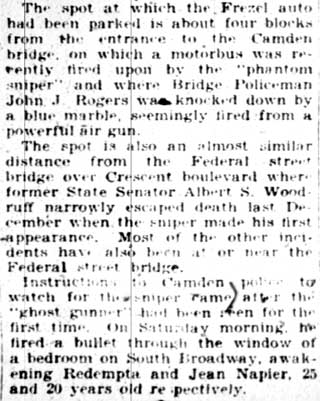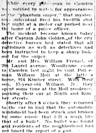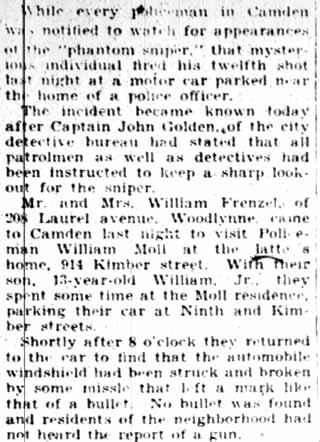 Camden’s “phantom sniper” has been seen. The man who had terrorized occupants of motorbuses, drivers of automobiles and residents of homes upon which he has fired during the last two months is no ghost, but a man of flesh and blood. He is tall, fleet of foot, and he knows a man named “Louie” . This at least is the description given to Camden police today by two young girls, who escaped the “ghost gunner’s” latest bullets this morning. The girls were asleep in their bedroom, in the Centerville section, when the “sniper’s” shot sped through their window. A short time before a bullet-like missile had crashed through the window of a Public Service trolley car, bringing the total number of occasions on which the “phantom” has appeared to 11. The girls, through the window whose bedroom a bullet sped at 4:45 o’clock this morning are the Misses Redempta and Jean Napier, 25 and 20 years old respectively, daughter so Peter Napier, former Camden Prohibition agent, who is now in the south. Jean, youngest of the sisters, is a former Camden High School student and widely known as a participant in amateur theatricals here and in Philadelphia. That incident marked the tenth occasion on which the sniper has fired upon vehicles in Camden and the fourth attack he has made this week. He fired a bullet through the windshield of a Pennjersey bus on the Camden side of the Delaware River Bridge, struck a bridge policeman with a large marble fired from a slingshot or powerful air compression gun, and fired a shot through the store window of Gottlob Mayer, Twenty-seventh Street and Hayes Avenue as his activities for the week. It was no “blue marble” such as that which struck Bridge Policeman John J. Rogers on the Camden bridge a few days ago that crashed through the Napier girls window. It was a leaden bullet. This latest appearance of the “ghost gunner” is notable for the fact that the bullet was found. Only in the first of the cases in which former State Senator Albert S. Woodruff was fired upon in his automobile has the bullet fired by the “phantom” been discovered afterward. The bullet which entered the girls’ room was of .32 caliber. It penetrated the glass of the window, boring a hole about an inch in diameter. It struck a curtain at the window, which acted as a buffer and the bullet fell to the floor. Aroused by the breaking glass, Redempta and Jean leaped from bed and ran to the window. “We saw a man with a gun, standing across the street” the former said today. “He was looking up at our window. As we looked, he broke into a run. He reached the corner and I heard him say to another man: ‘It’s all right now, Louie.” City Detective Frank Truax was assigned by Camden police to investigate the latest appearance of the “phantom sniper.” The leaden bullet found on the floor of the girl’s bedroom was turned over to him. Meanwhile, several agencies began investigations of the “phantom’s” firing upon a trolley car this morning. The mysterious shooting by the “ghost gunner” at the trolley car this morning, marked the tenth occasion which the “sniper” has fired upon vehicles and the fourth attack he has made this week. He fired a bullet through the windshield of a Pennjersey bus in the Camden side of the Delaware river bridge, struck a bridge policeman with a large marble fired from a slingshot or powerful air compression gun, and fired a shot through the store window of Gottlob Mayer, Twenty-seventh Street and Hayes Avenue as his activities for the week. The motorman, George Washkruz, of 1114 Louis Street, and the passengers heard the bullet crash through the front window of the trolley car. A clean hole larger then pencil showed where the bullet had pierced the window. No report of a gun was heard and police believe the shot was fired by an English compressed air gun. United States Commissioner Wynn Armstrong was a passenger on the trolley when the bullet tore through the window. He was on his way from his home in Merchantville to his of-fice at Third and Market Streets in Camden. “A short time before,” Commissioner Armstrong said,” a coupe driven by a woman skidded and crashed into our trolley car as it was passing Morris Street. Naturally the passengers were excited about the accident. Luckily no one was injured. “The car was proceeding again toward Camden when suddenly there was aloud “ping” and we saw the motorman jump. He stopped the car and looked at the window. There was a bullet hole in the window but we searched the car but were unable to find the bullet or where it had lodged after entering the car. “We looked all around outside the car but was unable to see any person who might have fired the shot. We heard no report of a rifle or revolver accompanying the crash of the bullet.” When Washkruz reached the Market Street ferries, he reported the occurrence to the police. Several policemen hurried to the scene and reached the neighborhood but found no trace of the sniper. As in nearly all the other cases the bullet was fired from a southerly direction. “I didn’t know what happened.” Washkruz said. “I heard the bullet strike the window and I heard it sing as it passed by my head and go into the Interior of the car. I saw no one who might have fired the shot.’ George Rothery, manager of the southern division of the Public Service Transportation Company, said the company would start an investigation independent of that being made by the police in an effort to capture the sniper. The attack marks the first time a trolley car has been fired upon during the sniper’s reign of terror. Captain of Detectives John Golden said police would start a campaign to capture the fiend who Is endangering the lives of citizens. “We have received no report so far from the Public Service about the sniper’s activities this morning.” Captain Golden said,” but I will detail several plain clothes men immediately to run down thi
