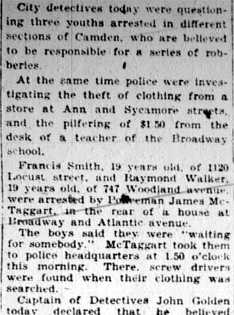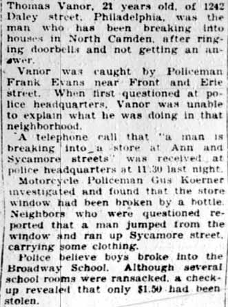 VANDALS A campaign to end vandalism in Camden has been launched by the North Camden Civic Association. After making an investigation, a committee including Mrs. Stephen Pfeil, Miss E. A. Stein and William Coghlan reported that $500,000 damage had been inflicted on vacant properties. The committee conferred with Acting Police Chief John W. Golden, one week ago and reported he promised to co-operate. The following statement was is sued by the committee: "Destruction of taxpayers' properties, as well as city property, MUST BE STOPPED. Many windows are broken by boys and young men playing ball on our streets. If they must play ball, then why not restrict them to soft rubber balls instead of hard balls? Properties not only are damaged, but anyone walking along the street is liable to be hit. "Not only windows are broken, but properties are literally torn down and plumbing ripped out. Just take a glance at the thousands of properties, homes, stores, factories, city bath houses and city parks destroyed beyond the means of owners to have them repaired so that they may get rents. This destruction of property is over our entire city and is not encouraging to outsiders to come to our city to live. "This menace must be curbed and it is up to our police to take more interest in their city and make it their business to look into these matters which occur on their beat. If the parents were held responsible for their children's acts they would take a little more interest in molding the characters of their children and eventually we would have better citizens. "The worst crimes are committed by the younger element from 16 to 26 years. Whether it is the fault of the police or their superior officers, or whether it be the fault of ward leaders or other politicians interceding, Chief of Police John Golden has taken a firm stand and has promised to give his utmost support to this committee.". |