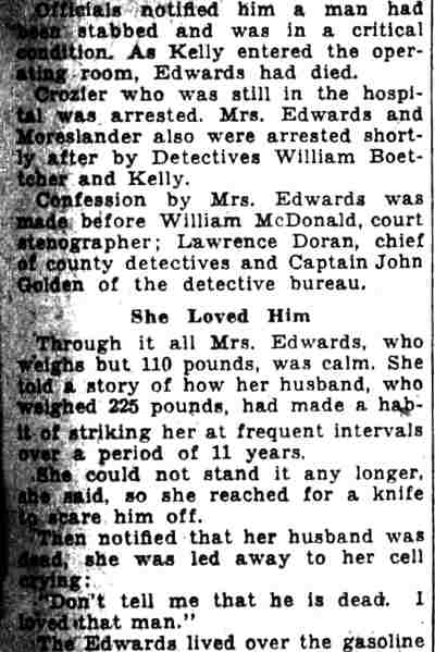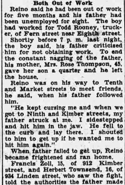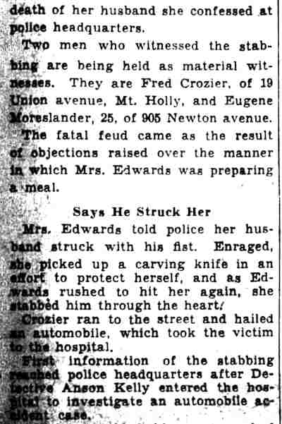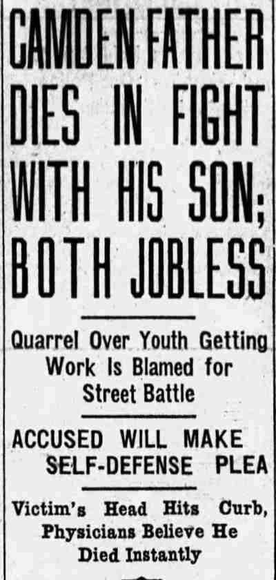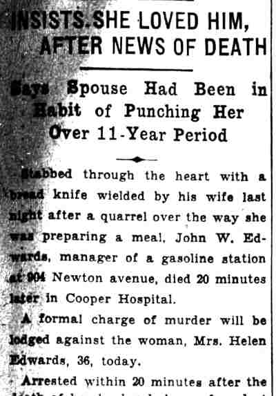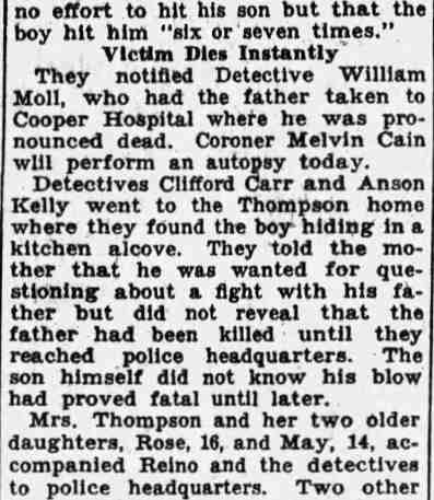 SLAIN BY JAGGED GLASS, HUSBAND HELD A death-bed command of a South Camden mother to her four children to stick to their story failed of its motive last night and the woman's husband was arrested on suspicion of murder. The charge will be changed today, police said, to one of murder. "Say only what I say, that I fell down the steps." Mrs. Philomena Marcozzi, 4l, died in West Jersey Homeopathic Hospital shortly after she made that remark; at 4 p.m. yesterday. She bled to death from a severe cut on her left arm. At her bedside were her children, Josephine, 15; Ida, 13; Louise, 17, and David, 19. Cops' Suspicions Aroused Nearby Out of sight of the dying woman, stood Detectives Clifford Del Rossi and Fiore Troncone. Their suspicions aroused, the sleuths renewed their investigation. As a result the woman's husband, Guilio Marcozzi, 55, of 321 Pine Street was put in the city jail last night, charged with the death of his wife. Mrs. Marcozzi was cut with the jagged edge of a broken wine decanter, during an argument with her husband over the cleaning of some hardshelled crabs. But it wasn't the children who said that. A neighbor, Mrs. Ida Lupini, 31, of 311 Line Street, was in the Marcozzi home when the children returned Sunday night from a crabbing trip to Sea Side Heights. She told police, they declared, that she saw the children jubilantly deposit their catch on the kitchen table. Then she watched, alarmed and afraid to leave, as Marcozzi told his wife to "throw them out." The wife refused. The husband insisted, and when his wife told him he should clean the crabs, he grasped the wine decanter and struck the mother over the temple, Mrs. Lupini said. Cut by Jagged 'Glass' The decanter broke. Grasping the long, neck of the bottle, Marcozzi continued to attack his wife. He swung the jagged edge towards her breast, and to protect, herself she raised her arm. The broken bottle cut deeply into her skin. An artery was severed. Then the children rushed, the mother to West Jersey Homeopathic Hospital. That is the story Mrs. Lupini told: according to Acting Chief of Police John W. Golden and Assistant Prosecutor Rocco Palese. The mother told hospital attaches she fell down the steps of her, home, cutting her arm on the broken bits of a bottle she was carrying at the time. The children, hearing this story, corroborated her. Wife Dying- Man at Work The father failed to appear at the hospital. Police were forced to get him at his work yesterday, according to Detective Joseph Carpani, when his wife was dying. Last night he denied the crime. He said he was not at home when his wife suffered the fatal injury. But his children, confronted with Mrs. Lupini's tale, broke down and confessed, according to police. Eighteen hours of almost constant questioning of the Lupini woman by Detectives carpani, del rossi and troncone solved the tragedy. All three were complimented last night by Acting Police Chief john w. golden. |
