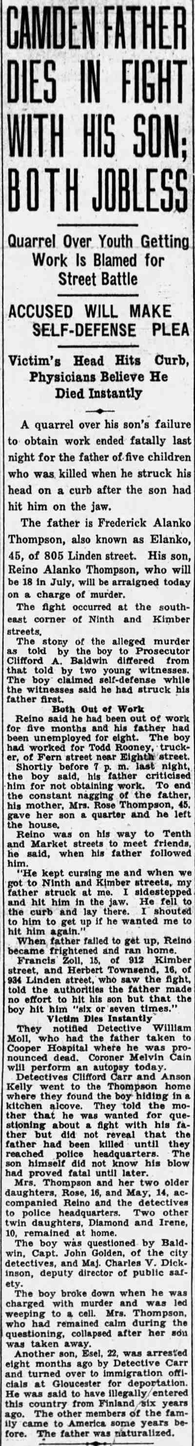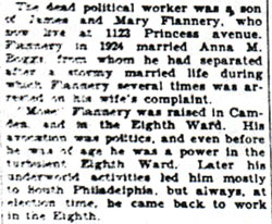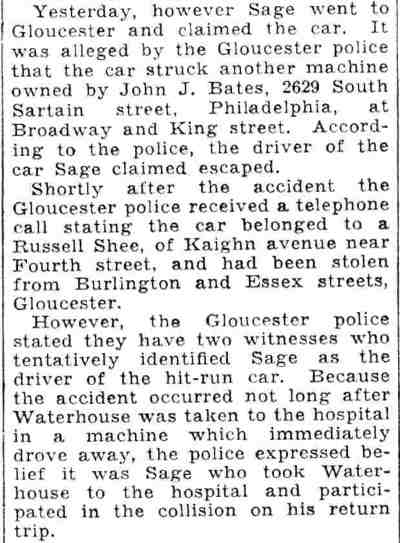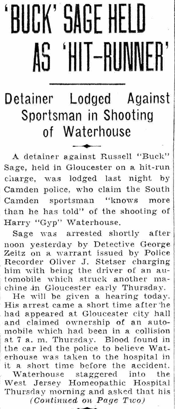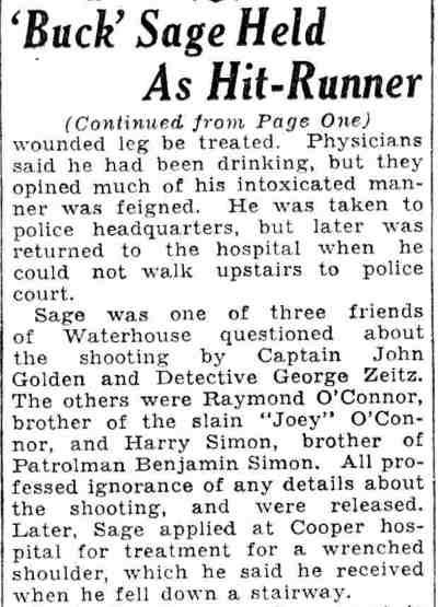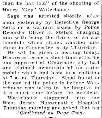 MOTIVE AT G.O.P. CLUB SPLITS SLEUTHS With city and county authorities definitely divided on the motive and circumstance if the Sixth Ward Republican Club slaying, Joseph "Polack Joe" Deven was arraigned in Camden police court today and held without bail on a murder charge. Through County Solicitor Walter Keown, retained as his attorney, Deven waived a police court hearing and was held to await grand jury action in the slaying of Joseph Cimini, Philadelphia gangster, at the political club early Saturday morning. At the same time County Prosecutor Ethan P. Wescott announced his operatives had abandoned the theory Cimini was killed as the aftermath of an attempted hold-up, and were concentrating their investigation in the case on an effort to "find the woman'. Statements of witnesses to the fatal shooting, the prosecutor added, made no mention of a hold-up, but contained the declaration that Cimini had been shot as a result of a feud with Charles "Chick" Hunt, former South Camden pugilist, concerning the affection of "Chick's girl". Police Claim Holdup On the other hand, Captain John Golden , chief of the city detective bureau, declared he was unable to recall any mention of a girl in the statements obtained from witnesses, and added emphatically that his department still held the shooting had followed an attempted holdup of the club by Cimini and Joseph 'Mose’ Flannery. Flannery and Hunt were both witnesses to the shooting by Deven, picturesque figure in Third Ward politics, which occurred at the Sixth Ward Club 's headquarters, 908 Broadway. . After Deven had appeared in Police Court today, Flannery was arraigned as a material witness and as an accessory to the crime, with an additional charge accusing him of carrying concealed deadly weapons. Similar charges were made against Russell Sage, a taxicab driver, who arrived at the club with Flannery and Cimini early Saturday morning. These two were committed to the county jail without any bail by Judge Bernard Bertman. Hunt, however, was released under $1,000 bail as was Martin O'Brien, 27 years old, a former New Jersey State Trooper, and Harry Waterhouse, 28 years old, 1102 Marion street. Three Others Arrested During the day the police continued to build up their case against Flannery by arraigning him on the charges made by Milton Feinstein and Henry Mehrer. The also arrested Joseph Genther, 29 years old, 414 Atlantic Avenue; Robert Wolfe, 21 years old, 1106 mechanic Street , and Eli Conaghy, 27 years old, 814 South 6th Street. Wolfe, who is Flannery's brother-in-law, and Genther were held "on suspicion" of having been with "Mose" at the time the latter is declared to have attacked and attempted to rob Mehrer, an Audubon policeman, outside the Ringside Inn, on the Black Horse Pike. Conaghy, Flannery and Sage were arraigned and held without bail on charges of threatening to kill Feinstein and of carrying concealed deadly weapons. Feinstein declares these three with Cimini, the slain man, entered his cafe on January 2 and attempted to hold him up, threatening to kill him if he refused to “come across”. When he defied them by telling them to “go ahead and shoot”, Feinstein says, they departed. Wolfe, Genther, and Conaghy were arrested by City Detectives George Ward and Thomas Cheeseman. It was Cheeseman who lodged the formal complaint of murder against Deven. Two Others Released Two other men who were questioned in connection with the murder case were in court this man but neither was held. They are Newton Blanchard, 923 St. John Street , a former boxing referee and alleged “stick man” at the crap game declared to have been in progress at the club before the shooting, and Michael Dandrea, 26 years old, of 1657 Norris Street. Both men had been released after questioning on Saturday. Police say they are the men who told police that trouble was imminent at the club and that “Flannery and another fellow are trying to stick up a bunch of other fellows.” The city police hold-up theory was further attacked today by Francis J. McCarthy, a Philadelphian, who arrived before noon at the county prosecutor’s office and said he would co-operate with the authorities. He wishes to clear the dead man, he said, of the stigma of suspicion that he was slain while engaged in an attempted robbery. Hearing in Police Court was brief. There was no testimony and Keown merely announced Deven would waive a hearing. Appearing also as attorney for Hunt, O’Brien, and Waterhouse, he said the other three men were “present at the unfortunate shooting” and thus should be held as material witnesses. He added the prosecutor’s office had permitted the release of the three under $1,000 bail each and requested Judge Bertman follow suit. The court acceded to this request but stipulated that new bail must be provided. The three men were freed shortly afterward when the bond was furnished by James Louis, 603 Kaighn Avenue, who had provided the bail yesterday in the prosecutor’s office. Despite the declaration by two Camden district detectives who were present at the time and who said there was no evidence that gambling was in progress at the club, county detectives disclosed today that statements of the shooting contained the assertion that the men had gathered for a crap game. These witnesses also declared the fatal shooting resulted from an argument over a woman for whose attention Cimini and Hunt were rivals. In circles where the leading figures in the shooting move, it was freely predicted things would be fixed up for Deven and that Flannery, political worker and supposed gangster, was to be "made the goat". Flannery is blamed by the city police for precipitating the battle. he has also been identified, according to County Detective Howard Smith, as one of the men who beat and robbed Henry Mehrer, an Audubon policeman, outside the Ringside Inn on the Black Horse Pike a fortnight ago. In addition, he is charges with attempting to hold up Milton Feinstei