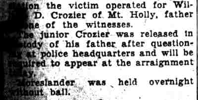 THEFT IS RE-ENACTED; TWO MEN HELD The $11,790 payroll holdup staged last Friday at the Radio Condenser Co., Thorne and cope wood streets, was, re-enacted yesterday. Two suspects nabbed late Monday, at Lykens in Dauphin County, Pa., played the "heavy" roles. Also in the cast were eight women and two men, employees of the firm. For an hour and 20 minutes the spectacular robbery was "rehearsed" under the direction of three Camden detectives. When the curtain was, rung down LeRoy Jenkins, 23, who police say has addresses at 1161 Mechanic Street and 1220 Princess Avenue, and Joseph Putek, 23, said to reside at 1462 Louis Street, were held on sus picion. They will be questioned further today. Has Nothing Definite Acting Chief of Police John W. Golden admitted he "has nothing on the boys." Detectives Benjamin Si mon, clarence arthur and Clifford Del Rossi, however, "were pressing pursuit of "hunches" and meager clues in attempts to solve the crime. There were several lines of information they obtained regarding the two suspects which will bear further study, si mon said. Putak, who has a po1ice record al though never convicted according to police, was questioned previously in connection with the Radio Condenser "job." He was released at midnight last Saturday. After that the detec tives centered attention upon Jenkins. They learned Jenkins borrowed an automobile from a man who operates a garage in the 1200 block on Atlantic Avenue. The garage man was reluctant to talk but under threat of arrest as an accessory he admitted lending a car to Jenkins. Fliers were dispatched to police throughout Pennsylvania, New York, Delaware and New Jersey. The car was halted at Williamsport, Pa. and when Camden police were identified they were surprised that Putak was Jenkins' companion. This stirred de tectives to renewed vigor in the probe. They learned the men were planning to visit relatives, of Jenkins in Williamsport and Pottsville. Acording to si mon police of both cities say Jenkins is well known to them. While at Williamsport the three de tectives learned Putak and Jenkins visited a vice den and quarreled with a woman over money. They quoted Jenkins as declaring that he "could buy and sell the joint!' Had Little Money Putak had but $3 when released Saturday and $11 when arrested, si mon revealed. He told the detectives he had won money in a poker game here. The two men were returned with the detectives as far as Philadelphia but refused to cross the river. They were turned over to police there on suspicion and. brought to this city yesterday afternoon. Taken to the Radio Condenser plant they were confronted with the ten employees who were herded in a vault during the holdup last Friday. According to si mon several of the employees felt there were certain mannerisms of the suspects which corresponded with actions of the bandits but confessed they were unable to definitely identify Putak or Jenkins as the heavily masked pair who threatened their lives with a revolver and shotgun. . The detectives propose an inquiry to al1 banks in this area in an ef fort to learn whether safe deposit boxes were leased by anyone answering the description of the suspects. The money obtained in the robbery was in bills and change of small de nomination, numbers of the bills were not available. Although never convicted Jenkins has a police record. Putak has never been formally under arrest, but has been questioned by the police in connection with various cases. Jenkins was arrested December 18, 1931, charged with larceny of gaso line, and on last July 9 was charged with several robberies. On April 2, 1931, he was held for the grand jury, charged with man slaughter after his automobile killed Mrs. Mary Cavanaugh, 70, a cook in the service of City Solicitor e. G. C. Bleakly. |