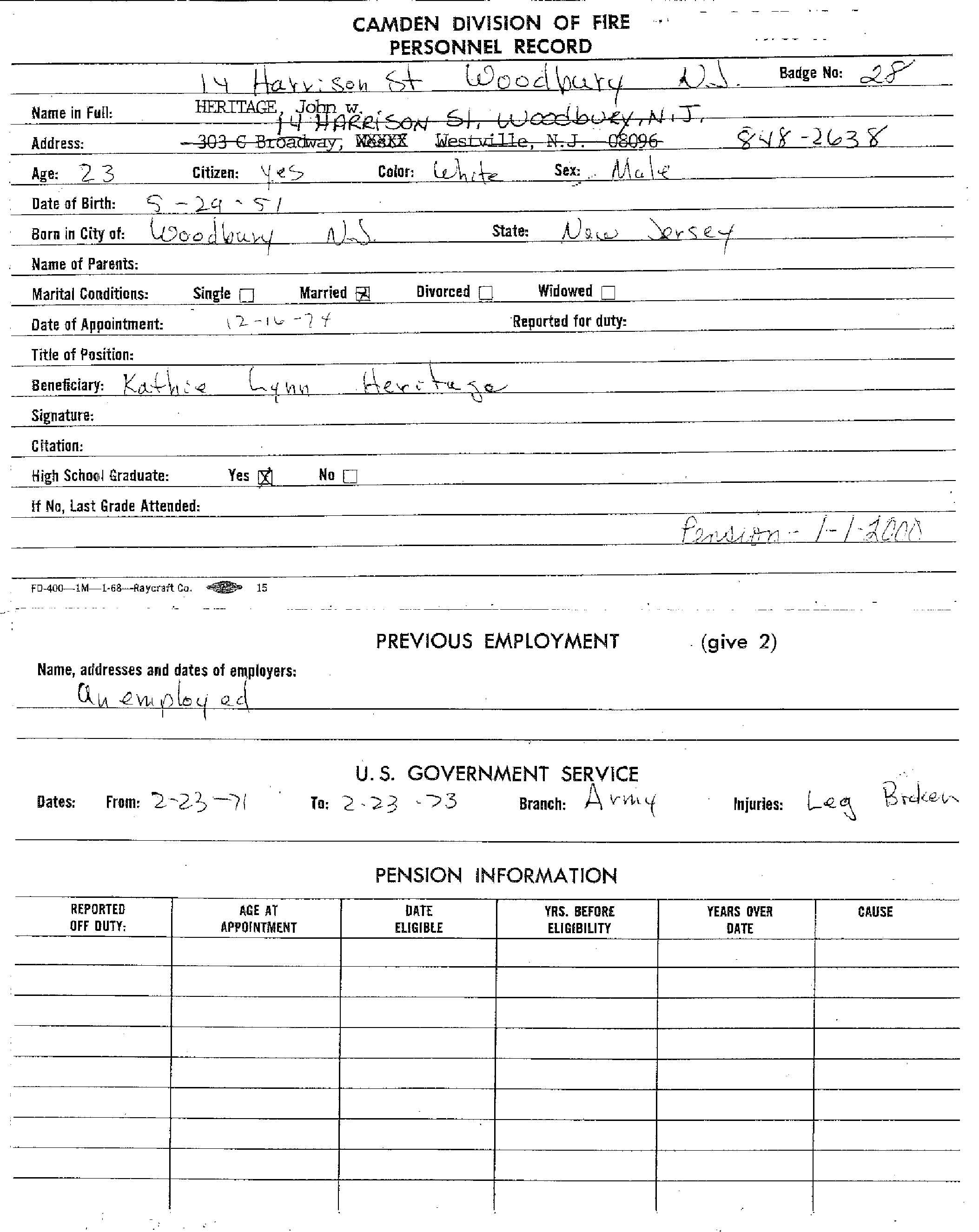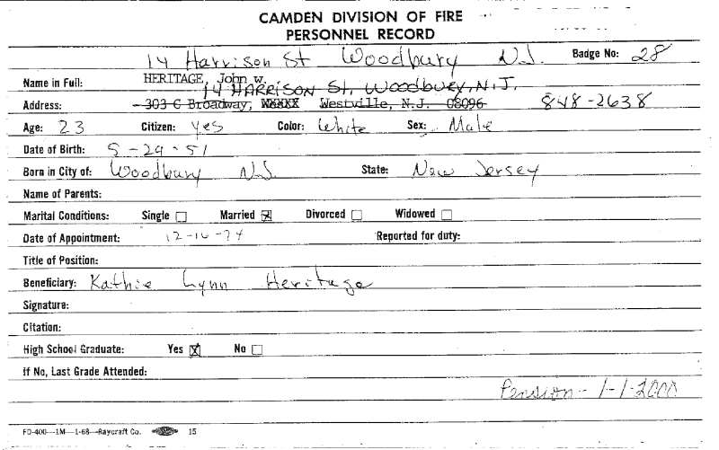 John was Captain for the City of Camden Fire Department and was employed as a fireman