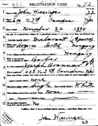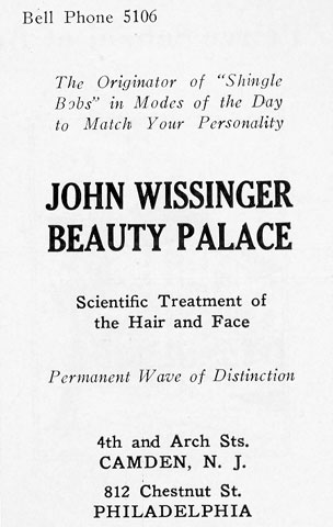 JOHN WISSINGER was born on November 22, 1894 in Bogoros, a town in what was then Hungary. He came to America in 1910. By June 5, 1917 he had moved to Camden NJ. When he registered for the draft he was living and working at 600 North 3rd Street as a barber for Joseph Brenner. He had already filed his Declaration of Intent to become an American citizen. When the census was taken in January of 1920 John Wissinger had moved to Philadelphia, where hi lived with his wife Julia and 8 month old son James at 1250 North Cadwallader Street. He had already by this time opened up his own shop. By 1924 John Wissinger had moved to 416 Market Street and opened up his beauty salon. He advertised often in print and eventually established a second location in Philadelphia, at 812 Chestnut Street. John Wissinger died in August of 1932. His wife Julia kept the business open under his name through at least 1938. By 1947, however, it was operating as Malin's Beauty Salon, with Frank Malin of Powelton Avenue in Philadelphia as proprietor. |