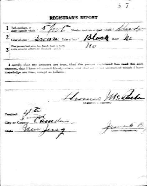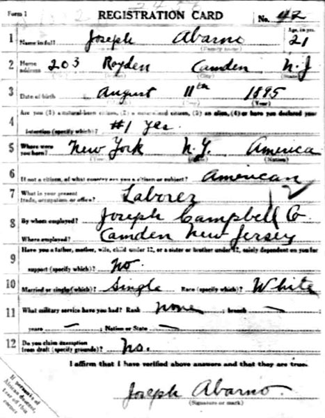 JOSEPH ARBANO was born in New York on August 11, 1895 to Domenic and Amerosa Arbano. Domenic Arbano had come to America in 1885 with his oldest son, James, in 1885. By 1917 the family had moved to 203 Royden Street in Camden NJ. When he registered for the draft on June 5, 1917, Joseph Abarno was working as a laborer at the Joseph Campbell Company, better known as Campbell Soup, in Camden. Joseph Arbano served in America's military during World War I, as did his brother Tony. The Arbano family had move to 419 Beckett Street by January of 1920. Domenic Arbano was working as a laborer at one of Camden's many shipyards, while both Joseph and older brother Tony were employed as riggers, also in Camden shipyards. Younger brother Frank, only 16, was working as a stamper as a morocco leather factory, while youngest brother Rocco, only 13, was still in school. When the Census was taken in 1930, Rose Arbano had passed. Joseph Arbano was living with his brother Tony Arbano, who had had married, and lived in a rented home at 316 Royden Street with his wife Mildred and their children Anna, Josephine, and Anthony. Also at home were father Domenic, and older brother James Arbano. Joseph Arbano was then working as a laborer at the Victor Talking Machine Company plant in Camden. His brothers also worked as laborers, Tony for either the County of City park system, and James for a road construction company. Joseph Arbano was still living on Royden Street in February of 1936. He is listed in the 1940 Camden City Directory at 567 Mickle Street. Joseph Abarno had moved to 9 Haddon Avenue by April of 1942, when he registered for the draft. The family had left Camden by 1947, and are not listed in the Camden City Directory for that year. |