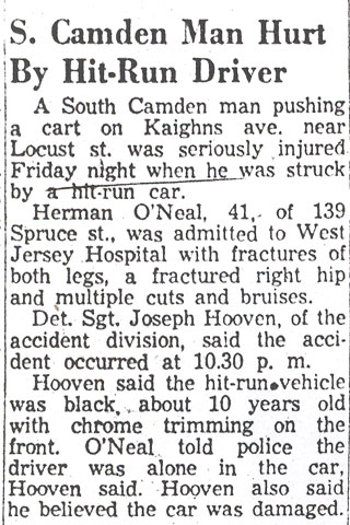 JOSEPH ANTHONY HOOVEN JR. was born on March 16, 1915 to Mary and Joseph A. Hooven. When his father registered for the draft in June 5, 1917 the family was living at 828 Spruce Street. Joseph Hooven Sr. was then working as a shellacker at the Victor Talking Machine Company plant. The family was still at the Spruce Street address in January of 1920, the elder Hooven then working as a house painter. He later went into business for himself under the trade name Joseph Hooven, Master Painter. A daughter, Mary, was born to the family in 1923. By 1924 the family had moved to 830 Spruce Street. The family moved to 918 North 19th Street in Cramer Hill in 1929. Joseph A. Hooven graduated from Camden Catholic High School in 1933. A top student, he was awarded a scholarship to Villanova University upon graduation. On November 16, 1940 Joseph Hooven Jr. was appointed to the Camden Police Department along with .Joseph Caputi Jr., Joseph Carroll, Roland Comerford, Julius Kaunacki, William Kelly, Frank Nelson, and Harry Tracy. The 1947 Camden City Directory shows Joseph and Ethel Hooven living at 464 North 34th Street in East Camden. The Hoovens were blessed with at least two sons, Joseph A. Hooven III, born in 1941, and John Hooven. The family lived at 464 North 34th Street through the fall of 1969. Joseph Hooven Jr. was promoted to Detective at some point after January of 1949 and by December of 1957 had been again promoted, this time to Detective Sergeant. By June 1967 Joseph A. Hooven Sr. had left the Camden Police Department. The Hoovens were gone from North 34th Street by October of 1970. The family move to Atco, New Jersey by the spring of 1978. Ethel Hooven died in March of that year. Joseph A. Hooven Jr. passed away on September 19, 1996. He was survived by his sons, John Hooven and Joseph A. Hooven III. |