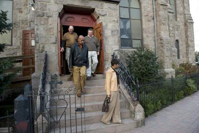 Mourners leave a viewing for Joe Balzano at Sacred Heart Church