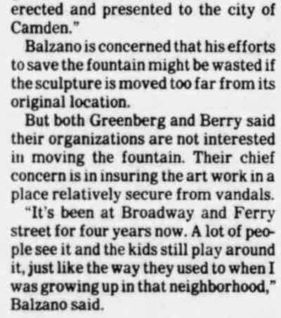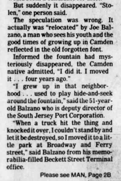 asserted. “Arguing with Joe is like playing chess with a master,” Thomas Corcoran, then president of the Coopers Ferry Development Association, said in 2005. The two frequently clashed over their visions for the Camden waterfront. “He adopts the old Chinese proverb of ‘Bend, but don’t break.’ And he probably puts in 100 hours a week at that port – I admire anybody like that.” Zane knew Balzano on a more personal level. His father had worked at the Beckett Street Terminal. The elder Zane was killed there in an accident in 1968. “Joe was very kind to my mother after that,” Zane reflected. “He was good to our family.” “He was just someone who was very likable and certainly very devoted to the success of the South Jersey Port Corporation.” Balzano also was instrumental in getting the Battleship New Jersey berthed in Camden, noted state Sen. Donald Norcross of Camden. Future generations will remember him, suggested Norcross. “Joe Balzano was the embodiment of Camden’s rich industrial past,” said Norcross, “and through his work at the port he passed on his skills, work ethic, and integrity to the new generations that will carry his beloved city into the future.” |