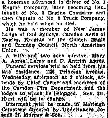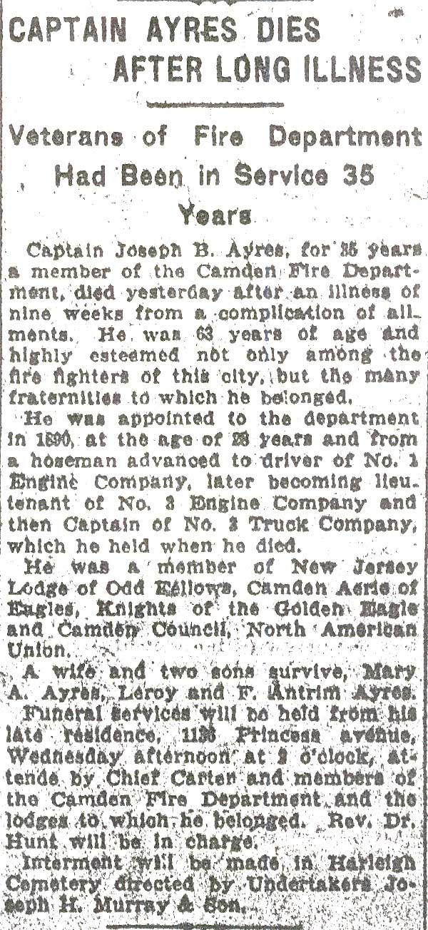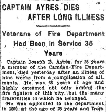 Joseph B. Ayres married in 1886. He and his wife Mary were living at 512 Kaighn Avenue by the spring of 1887. Joseph B. Ayres had returned to work as an oilcloth printer. On July 1, 1890 he was appointed to the Camden Fire Department. His first assignment was Driver for Engine Company 1. He was later promoted to Lieutenant of Engine Company 3. By 1914 he had been promoted to Captain of Ladder Company 3 in East Camden. Joseph B. Ayres remained with the Camden Fire Department until his passing in 1925.