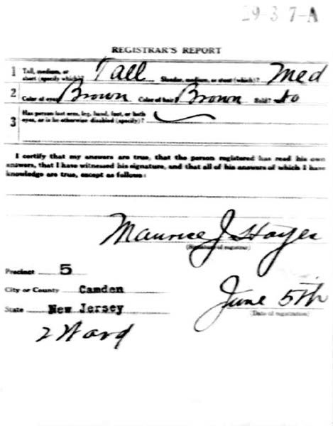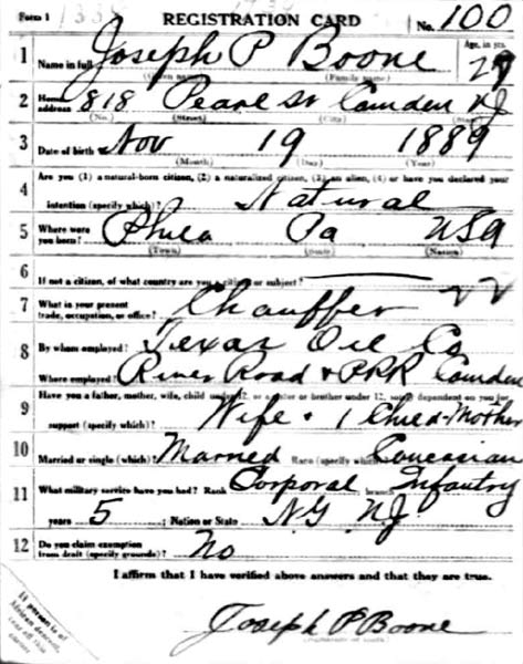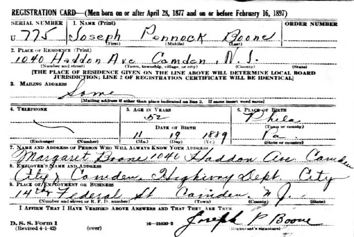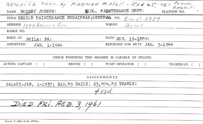 JOSEPH PENNOCK BOONE was born in Philadelphia on November 19, 1889 to Laura and Joseph Boone. The 1910 Census shows that he had moved with his widowed mother and younger sister Elsie to 151 Toledo Avenue in Haddon Township, New Jersey. This was the home of his grandfather, Anthony Mason. Joseph P. Boone worked installing parquet floors. He had moved to 443 Cherry Street in Camden by 1914, and was still working as a floorlayer. His mother had moved to Camden with him. When it was time to register for the draft in June of 1917, Joseph Boone had moved once again, to 818 Pearl Street in North Camden. By this time he had married and his mother also was still living with him. Joseph Boone was then working as a driver for the Texas Oil Company, which was located on River Road where the Pennsylvania Railroad tracks crossed. By January of 1920 Joseph P. Boone had moved to Philadelphia where he operated a cigar store. He had limited success in this venture, and by 1930 had moved back to New Jersey. He mad his home with his wife Margaret and two step-daughters, Edna and Dorothy Shaffer, another step-daughter, Mildred, had already gone out into the world. The family resided at 48 East Beechwood Avenue in Oaklyn. When he registered for the draft in 1942, Joseph and Margaret Boone had moved to 1040 Haddon Avenue in Camden NJ. He worked for the City of Camden's highway department until January 5, 1944 when he went to work for the Camden Fire Department in the title Senior Maintenance Repairman, General. Joseph P. Boone worked for the fire department until January of 1961. On the 25th of that month he was replaced by veteran fireman Morris Odell on orders from City Commissioner Garrity. Joseph P. Boone died on February 3, 1961 |