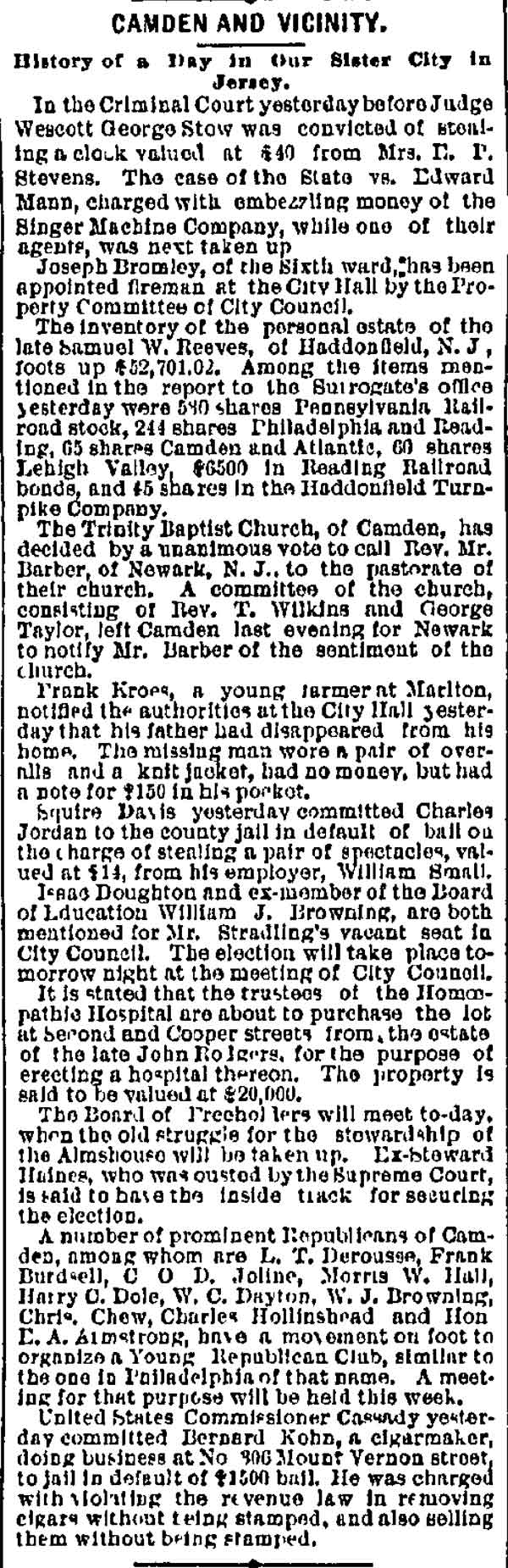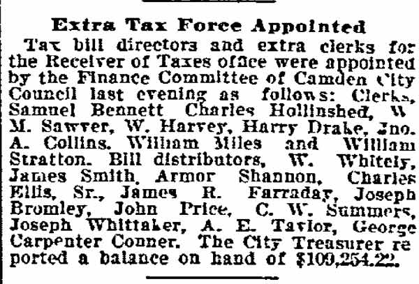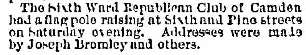 JOSEPH BROMLEY was quite active in Camden politics in the 1880s and 1890s as a Republican from Camden's Sixt Ward. He does not appear to have ever worked full-time in government, however, One of three brothers who were appointed to the Camden Fire Department, he does not appear to have served for very long. His brother Daniel Bromley was appointed to the Camden Fire Department as an extra man with Engine Company 1 on April 5, 1882 and Bromley served for two years. Brother Wilson Bromley was appointed to the Camden Fire Department in 1884 and served until his death from injuries suffered in the line of duty in 1896. Joseph Bromley was appointed to the Fire Department in November of 1886, but does not appear to have served for any great length of time.