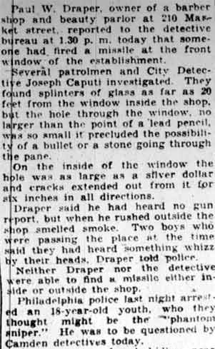 SHOT HITS MARKET STREET WINDOW Crashes Glass of Barber Shop at No. 210- Two Boys Escape Missile |