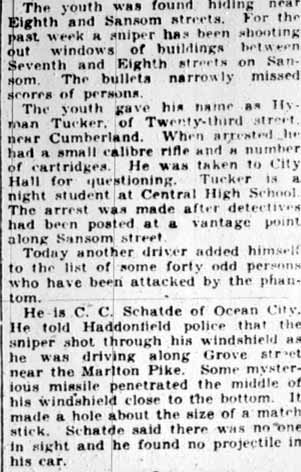 Two men were arrested yesterday by a Camden policeman, who charged they interfered with his investigation of an automobile accident at Ninth Street and Kaighn Avenue,. Richard Mayer, 28, of 373 East Gowan Avenue, Mt. Airy, Pa., and Joseph Meraglo, 23, of 1016 South Fourth Street, Philadelphia, were fined $25 each by Police Judge Pancoast. Both were charged with disorderly conduct. Mayer also was charged with reckless driving. Joseph Devlin, 42, of 1919 Mifflin street, Philadelphia, was held in $1000 bail by Pancoast to await the outcome of injuries suffered by a woman passenger in his car. The woman, who gave her name as Miss Jane Glenn, 36, of 2506 South Twenty-second Street, Philadelphia, is in West Jersey Homeopathic Hospital. Doctors say her condition is not serious. The accident occurred at 2:20 AM. Motorcycle Policeman Earl Wright and other policemen were at the scene in investigating, when an automobile flashed by. Wright in court said he blew his whistle and declared the car was unable to stop within 100 feet. Wright said he was questioning Mayer when Maraglo "butted in," and stated, "I'll get this fixed up tonight". Wright testified he searched Mayer for a gun and Mayer replied, "I haven't got it on me tonight." In court both Mayer and Meraglo said they were not speeding, and didn't interfere with the officer. Devlin was released for court by Detective Joseph Caputi. Devlin's automobile was in collision with the car of Edward Kaligian, 30, of 1251 North Twenty-eighth street. |