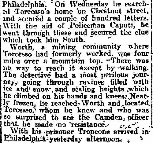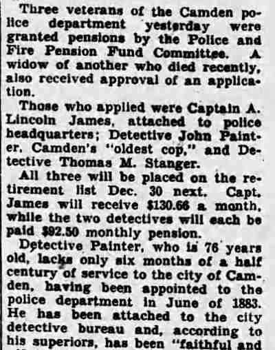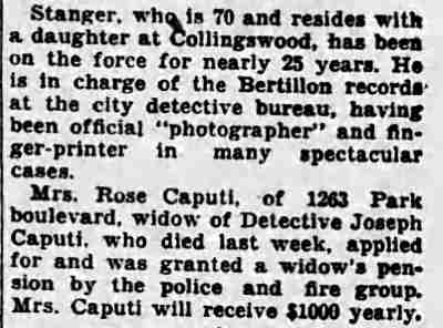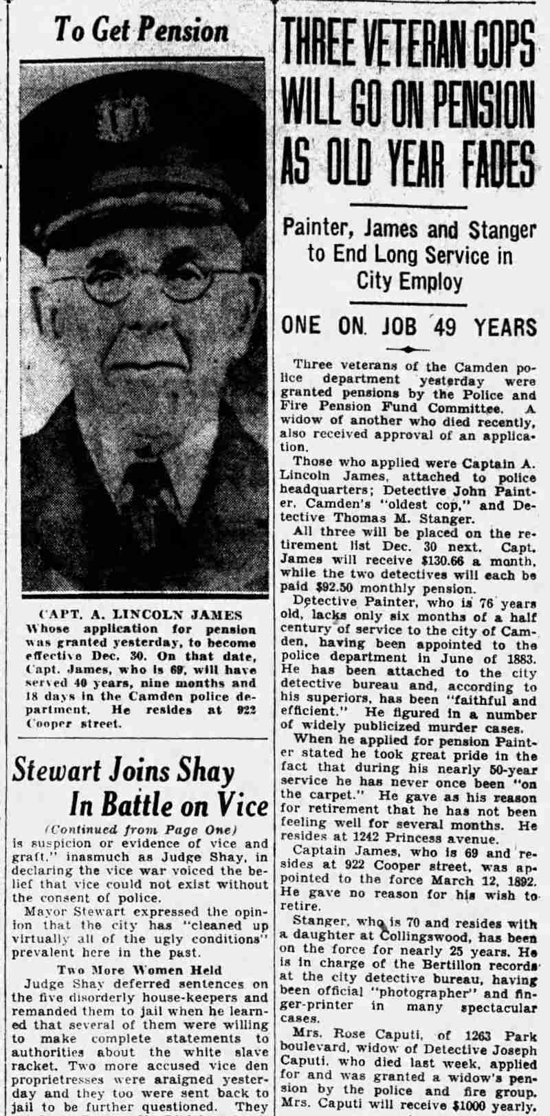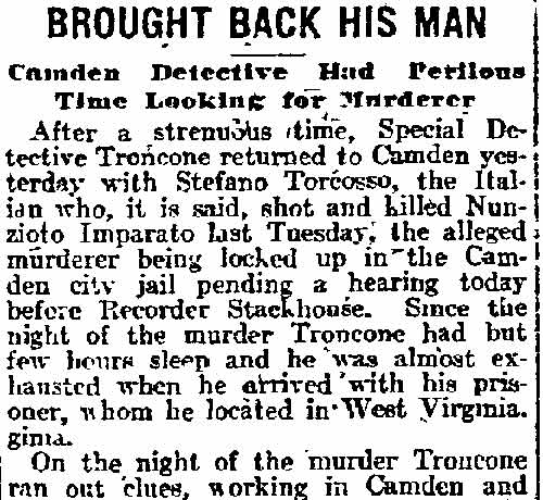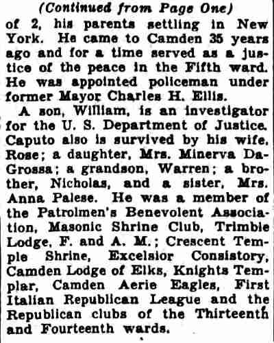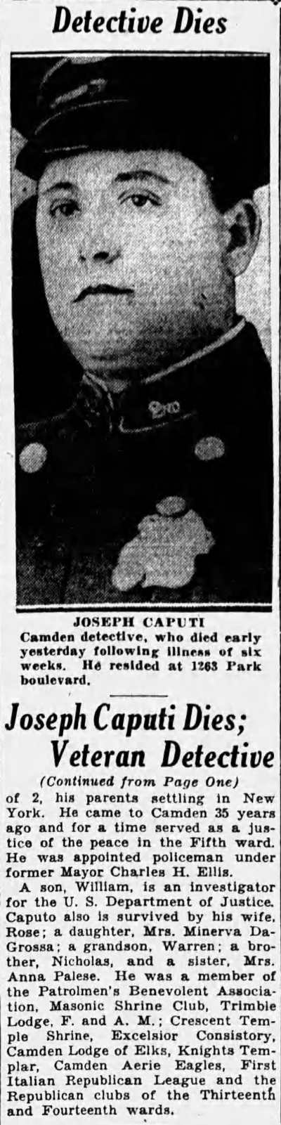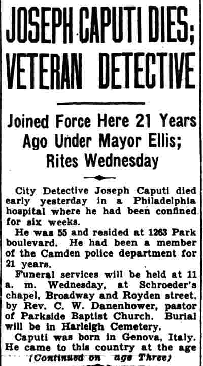 JOSEPH CAPUTI was born in Genoa, Italy on June 4, 1876, and came to the United States in 1890. He appears in the 1910 Census in Camden as owning a home at 827 South 3rd Street in South Camden. He had been married to his wife Rose for 12 years. The Caputi family then included two children, Minnie and William. Joseph Caputi Sr. was then working as a traveling salesman for a cigar company. He had already become an American citizen. Not long after the 1910 Census was enumerated, Joseph Caputi secured an appointment to the Camden Police Department. A Detective by the end of 1927, he was often partnered with Detective Frank Truax. The Caputi family had moved to 1012 South 3rd Street by 1914. By the time the census was taken in April of 1930, they had moved to 1263 Park Boulevard in Camden's Parkside neighborhood, not far from Frank Truax's home at 1139 Kenwood Avenue. After an illness of six weeks, Joseph Caputi passed away at a Philadelphia hospital on November 13, 1932. His widow Rose then still resided at 1263 Park Boulevard. Son William Caputi lived at 1311 Park Boulevard, and was involved in real estate in Camden. Joseph Caputi's nephew, Joseph V. Caputi, served as a Camden policeman from 1940 to 1970. He retired in 1970 as a Lieutenant of Camden Police Department, then joined the Public Defenders office and became a Principle Investigator . Joseph V. Caputi died on February 25, 1989. His son, Joseph R. Caputi joined the Camden Police Department in 1968, and retired in 2001 as a Sergeant. |