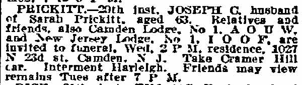 Joseph Prickitt was still living at 208 Bailey Street in the spring of 1884 when he was appointed to the Camden Fire Department to serve as an extra man with the Hook & Ladder Company, replacing William Maguire. He served until July 1, 1885 when the Fire Department was reorganized and eighteen of the extra men were let go. Joseph C. Prickitt was one of that number. Joseph C. Prickitt next appears in Camden City Directories in 1885. He was then working as a foreman and living at 541 Cedar Street. By the end of 1890 he had relocated to Cramer Hill, residing at 706 Cooper Street. Cooper Street was renamed North 27th Street after Cramer Hill and East Camden were annexed to Camden in 1899. Joseph C. Prickitt had begun working for the Pennsylvania Railroad. He stayed at that address through 1897. The 1898 and 1899 City Directories show Joseph Prickitt at 2801 Arthur Avenue. By the time the 1900 Census was taken he had moved to 728 Union Street, which was renamed North 24th Street shortly thereafter. The 1900 Census shows Joseph Prickitt and his wife Sarah, with children Walter, Ralph, Clarence Raymond, and Harry. The 1910 Census shows Joseph and Sarah Prickitt at 1027 North 23rd Street in Cramer Hill. The four surviving Prickitt children were at home, Walter E., Ralph E., Clarence Raymond, and John A. Prickitt. He was at this time working as a watchman in a department store. Joseph Prickitt had passed away on March 29, 1913. His widow and sons Walter, Clarence Raymond, and John Prickitt were still living at 1027 North 23rd Street when the census was taken in 1920. Joseph Prickitt was a longtime member of New Jersey Lodge No. 1, Independent Order of Odd Fellows and of Camden Lodge, No. 1, Ancient Order of United Workmen. George Reeser Prowell wrote the following in his History of Camden County, New Jersey which was published in 1886: Ancient Order of United Workmen. The object of this order is to embrace and give equal protection to all classes and kinds of labor, mental and physical; to strive earnestly to improve the moral, intellectual and social condition of its members; to create a fund for the benefit of its members during sickness or other disability, and, in case of death, to pay a stipulated sum for each member, thus guaranteeing his family against want. Its jurisdictions are a Supreme Lodge, Grand and Subordinate Lodges. The Grand Lodge of Maryland, New Jersey and Delaware is thus officered: G. M. W., John J. Gallagher, of Wilmington, Del.; G. F., William H. Vermilye, Jersey City, N. J. ; G. O., James A. Vansant, Camden, N. J. ; G. G., John W. Diefendorf, Wilmington, Delaware; G. R., A. F. Colbert, Baltimore; G. Receiver, Myer Hirsch, Baltimore; G. M. E., G. S. Wilkins, M.D., Baltimore. Camden Lodge, No. 1. was chartered January 27, 1879, with these officers: Master Workman, Joseph R. Leaming; Foreman, Charles Markley; Overseer, George W. Coles; Recorder, Harry Ladow; Financier, William Thegen; Receiver, Albert P. Brown; Guide, William P. Partenheimer; Inside Watchman, Benjamin M. Denny; Outside Watchman, William Jones; Medical Examiner, H. Genet Taylor, M.D. These were also charter members, Moore Beideman, Robert L. Barber, John F. Benner, De Witt C. France, Joel H. Evaul, Henry S. Fortiner, George R. Fortiner, Howard L. Gandy, Merritt Horner, William Struthers, Benjamin G. Smith, William H. Stans bury, Marmaduke B. Taylor, Frank S. Wells, John S. Wells. The lodge has one hundred and forty- eight members, with these officers: Past Master Workman, J. C. Prickett; Master Workman, Virgil Willetts; Foreman, J. H. Le Chard; Overseer, R. R. Lewellen; Receiver, W. R. Lun drum; Financial Secretary, Charles Markley; Recording Secretary, John Woltjen; Guide, J. S. Pike; Inside Watchman, John W. Clopper, Jr.; Outside Watchman, J. H. Evaul; Medical Examiner, E. R. Smiley, M.D. |