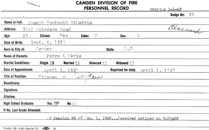 Joseph D. DiMattia was appointed to the Camden Fire Department on April 1, 1952. He reported for duty the same day. He retired from the department on pension effective January 1, 1968, having achieved the rank of Captain.. Joseph D. DiMattia passed away on August 15, 1985. |
