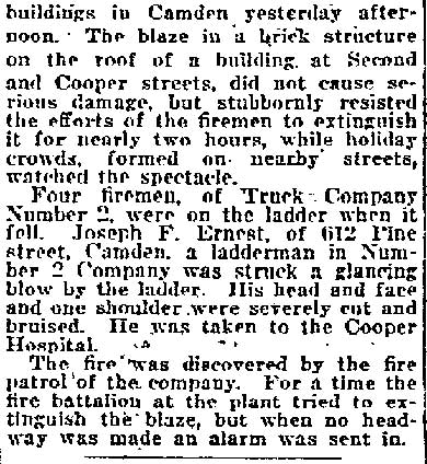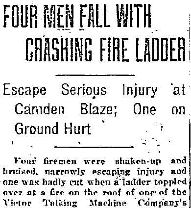 Marter Joseph Sparks - George Boone - Roy A. Smith - Edward Simpson - Henry C. Knowles Samuel S. Elfreth - George P. Cox - Walter W. Browning - George B. Wade - John A. Stockton Joseph F. Ernst - John A. Dold - Josiah Sage - Daniel Smith - Arthur Wingate - Joseph T. Johnson Harry Hankins - William Laird - William Elberson - John H. Lennox - Martin Carrigan - Charles Cook Harry Selby - Herman O. Kreher - Daniel P. McConnell - William Howell Tatem Harry C. Anderson - Steward Bakley - Joseph Maxwell William Robinson - Richard Sauer - John Watson - Albert Glanders - Ladder Company 1 Charles Menke - Edward S. Gahan - Engine Company 7 - Engine Company 2 |