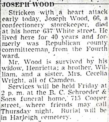 JOSEPH F. WOOD was born in Pennsylvania around 1884, the son of German-born parents. He came to Camden around 1910. At the time of the 1920 census, he was living with wife Henrietta at 701 South 4th Street, and working as a riveter in one of Camden's shipyards. By 1930 he had purchased a home at 637 White Street, between 4th and 5th and Line and Beckett Streets, in Camden, and was working as a clerk for the city. He also owned and operated a candy store at the White Street address. A staunch Republican, he served as a committeeman from what was then Camden's Fourth Ward. Joseph Wood passed away from a fatal heart attack on June 1, 1950, and was buried at Harleigh Cemetery. Childless, he was survived by his wife, a brother William, and a sister, Mrs. Cecelia Wright, all of Camden. |