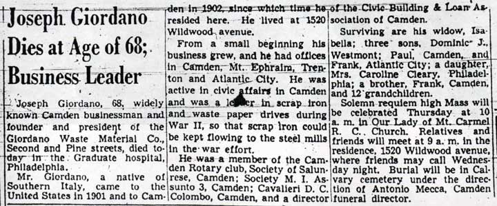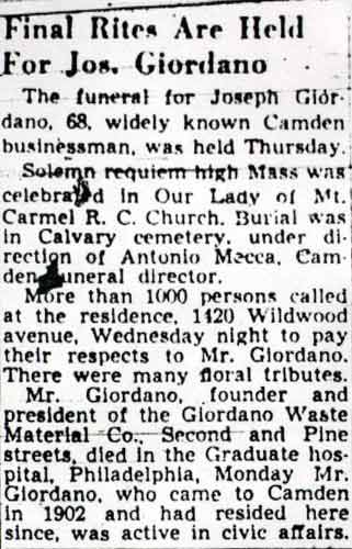 JOSEPH GIORDANO was the founder and president of the Giordano Waste Material Company in Camden NJ. After coming to America in 1901, he settled in Camden the following year. He built his scrap metal business into a large company with operations in New Jersey and Pennsylvania. Joseph Giordano lived with his wife Isabella at 1520 Wildwood Avenue in the Parkside neighborhood of Camden NJ. He was involved in civic and fraternal affairs. During World War II, he was a leader in the scrap metal drives crucial to the war effort. He passed away in 1951 at the age of 68 at Graduate Hospital in Philadelphia, and was buried at Calvary Cemetery in Delaware Township (present-day Cherry Hill) NJ. |