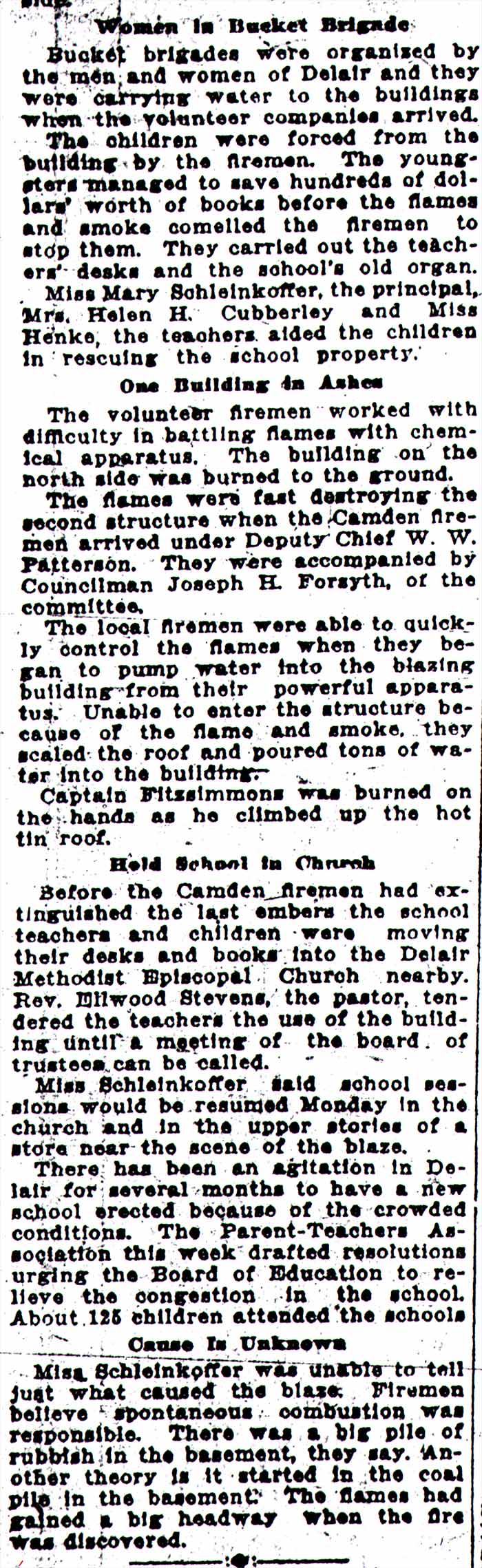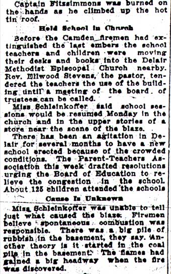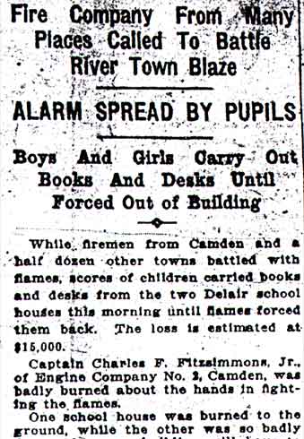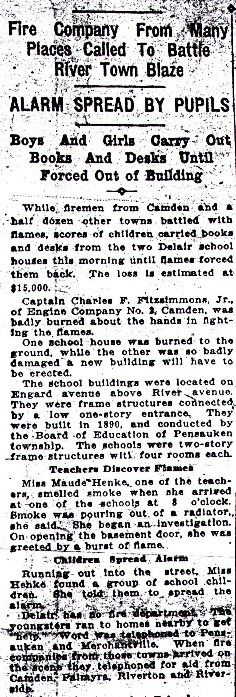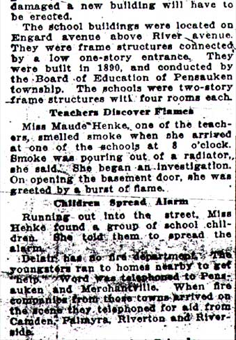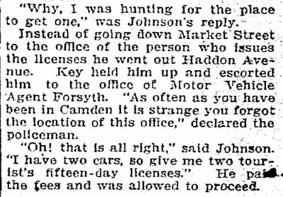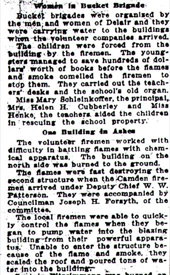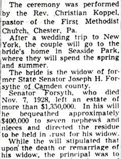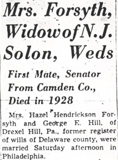 Word was received last night that Mrs. Mabel Forsyth, widow of former State Senator Joseph H. Forsyth, and her son and three sisters were robbed at Erie, Pennsylvania, en route to the Chicago fair. She was accompanied by Mrs. Grace Gerry, Mt. Holly, and Miss Josephine Hendrickson, Mt. Holly, sisters, and her son Jack and a chauffeur. They stayed over night. Wednesday in a hotel at Erie. When they arose in the morning they discovered several hundred dollars' worth of their jewelry and $300 in cash had been taken by a hotel thief. Mrs. Forsyth formerly lived on Cooper street, near Seventh, and later, in Haddonfield. She now resides in Rittenhouse Square, Philadelphia. |
