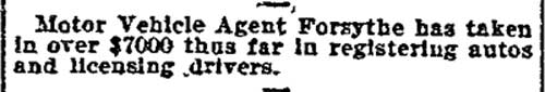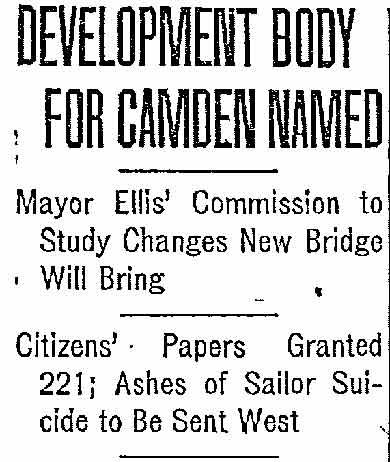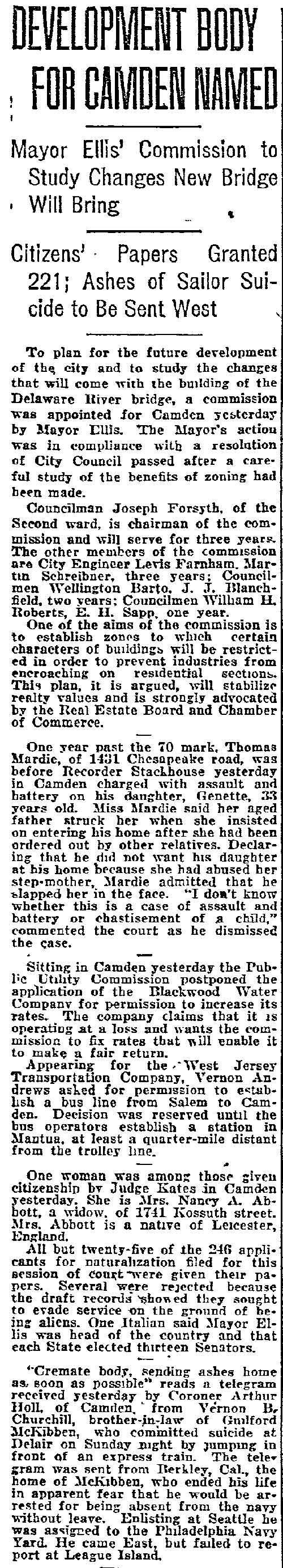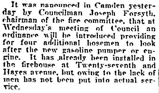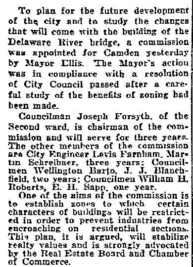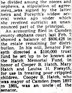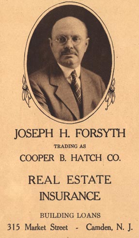 JOSEPH H. FORSYTH was born in Burlington County NJ on May 30, 1879 to Joshua and Luisa Hatch Forsyth. His father was a farmer, and at the time of the 1880 census the family lived in Pemberton NJ. His uncle was Cooper B. Hatch, who was Mayor of Camden NJ from 1898 to 1902. By 1920 Joseph Forsyth had established himself in Camden NJ, and had a prosperous real estate and insurance business, trading as the Cooper B. Hatch Company, at 315 Market Street. At the time of the 1920 census he was living at 708 Cooper Street with his wife Hazel. Joseph Forsyth served as a state senator from Camden in the 1920s, and was still serving in that capacity as late as 1928. In January of that year he proposed a bill in the State Senate exempting Camden from participation in the state Civil Service system. While the bill had support from may of the old guard Republican politicians locally and state wide, it did not deter the movement to institute Civil Service regulation of government jobs in New Jersey, which by the mid-1930s was virtually universal throughout the state. Joseph Forsyth passed away on November 7 of that year, leaving a large estate. From his estate he established the Cooper B. Hatch Foundation, to aid crippled children from poor families. |