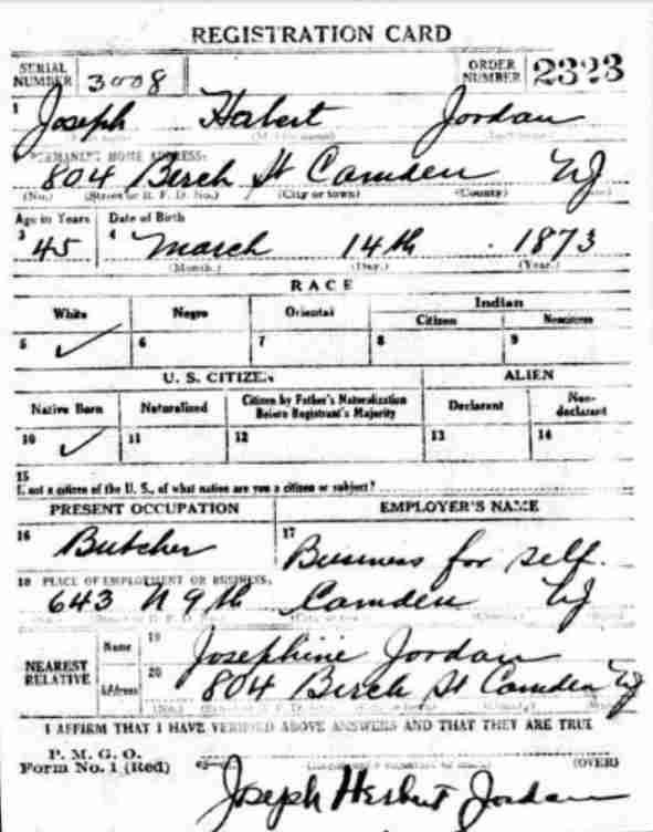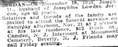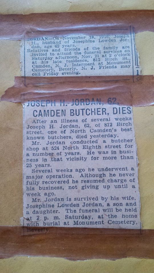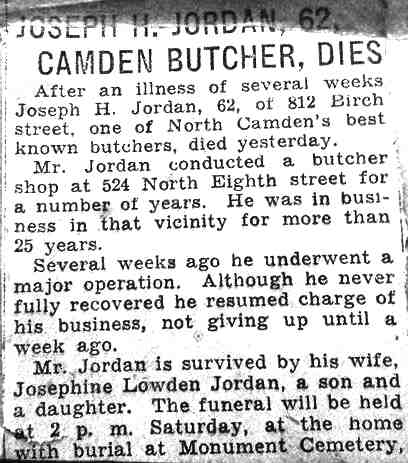 JOSEPH HERBERT JORDAN was born on March 14, 1873. He married Josephine Lowden in the early 1890s, and the couple were blessed with a daughter, Bessie, in 1894. The 1900 Census shows the family living in Beverly, New Jersey. Joseph H. Jordan worked as a butcher to support his family. The Jordans moved to Camden in the mid-1900s, first appearing in City Directories in 1908 at 542 north 8th street, where they resided through 1913. by the time the 1914 camden city directory was compiled, the family had moved to 804 birch street. asecond daughter, ruth, was born around 1914. the jordan's stayed at 804 birch street into 1920. that year they moved a few doors east, to 812 birch street. in 1915 joseph h. jordan opened up a meat market at 643 north 9th street. he remained at this location into 1921, when he opened up at a new location, 524 north 8th street, the corner of north 8th and birch streets, a stones throw from his home. Survived by his wife and children, Joseph H. Jordan passed away on November 18, 1936. He was buried at Monument Cemetery in Beverly, New Jersey. His wife joined himn in 1960. |