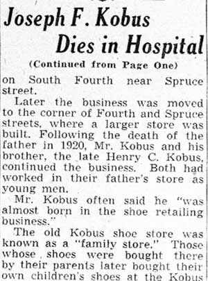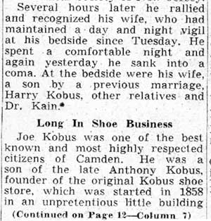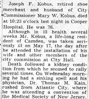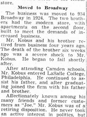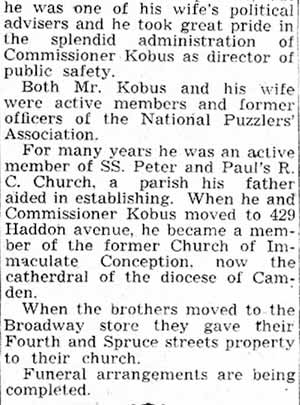 JOSEPH F. KOBUS and his brother Henry were the sons of Anthony Kobus, who founded a shoe business at 943 South 4th Street in 1858, which soon was moved to the corner of South 4th and Spruce Streets. Born in Camden in 1863, Joseph Kobus and his brother maintained the business until they both retired in the early 1930s. anthony kobus was a principal in the Broadway Trust Bank, and, after his death in 1920, Joseph and Henry Kobus moved the business to a nearby building at 934 Broadway in 1924. As a young man, Joseph Kobus became interested in crosswords, cryptograms, and other similar puzzles. In in 1883 was one of the charter members of the National Puzzlers League. He held his membership throughout his life. Joseph Kobus' second wife Mary Walsh Kobus was one of Camden first female politicians. She was elected to the City Commission, and served as the Director of Public Safety in the late 1930s and early 1940s. She also was a nationally recognized puzzler, and was president of the afore-mentioned National Puzzlers League in 1929. Henry Kobus passed away in April of 1939. Joseph Kobus, who was suffering with kidney problems, took a turn for the worse after his brother's passing, and died on June 9, 1939. He was survived by his wife Mary, and a son Harry Kobus, from his first marriage. |