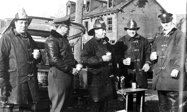 Fire Canteen Unit and members of engine company 7 after a general alarm fire on December 14, 1959. From left: Captain Anthony Saponare, Volunteers of America Colonel William Gwynne, Fire Fighters Carl Szalkowski, Joseph "Slick" Verderosa, and Joseph "Big Joe" Lesniewski.