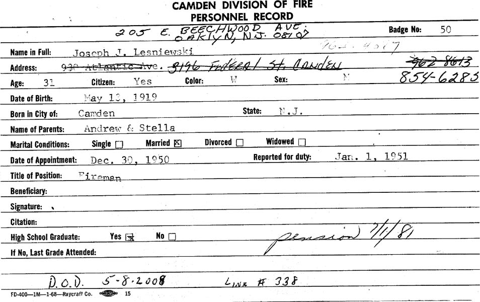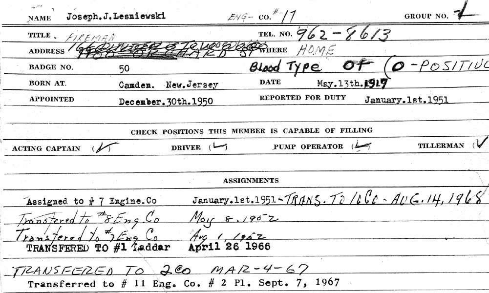 JOSEPH J. "BG JOE" LESNIEWSKI was born in Camden on May 13, 1919 to Stella and Andrew Lesniewski. The Lesniewskis were living at 1156 Jackson Street when the 1918-1919 City Directory was compiled. By 1924 they had moved to Pennsylvania. Joseph Lesniewski was working as a machinist and living in Pennsylvania when he enlisted in the United States Army Air Corps in Philadelphia on December 12, 1941. Joseph Lesniewski came to Camden after World War II, where he married Wanda Chomiczewksi, who lived and had grown up at 1440 Rose Street. He was appointed to the Camden Fire Department on December 30, 1950 and reported for duty on January 1, 1951 with Engine Company 7 at 1115 Kaighn Avenue. He stayed at Engine Company 7 until April of 1966 except for a three month long tour with Engine Company 8. Between April of 1966 and August of 1968 Joseph J. Lesniewski was transferred four times, to Ladder Company 1, Engine Company 2, Engine Company 11, and |