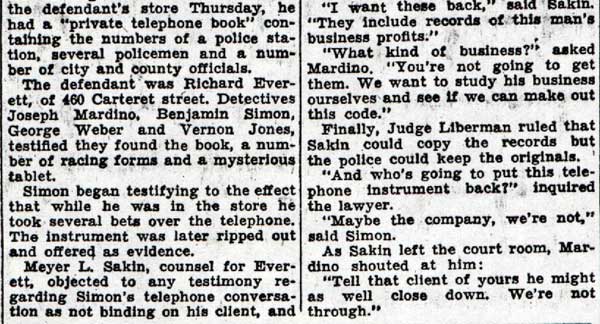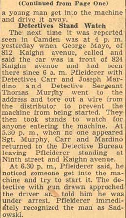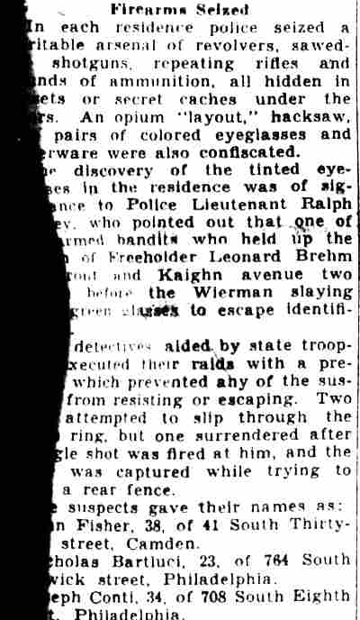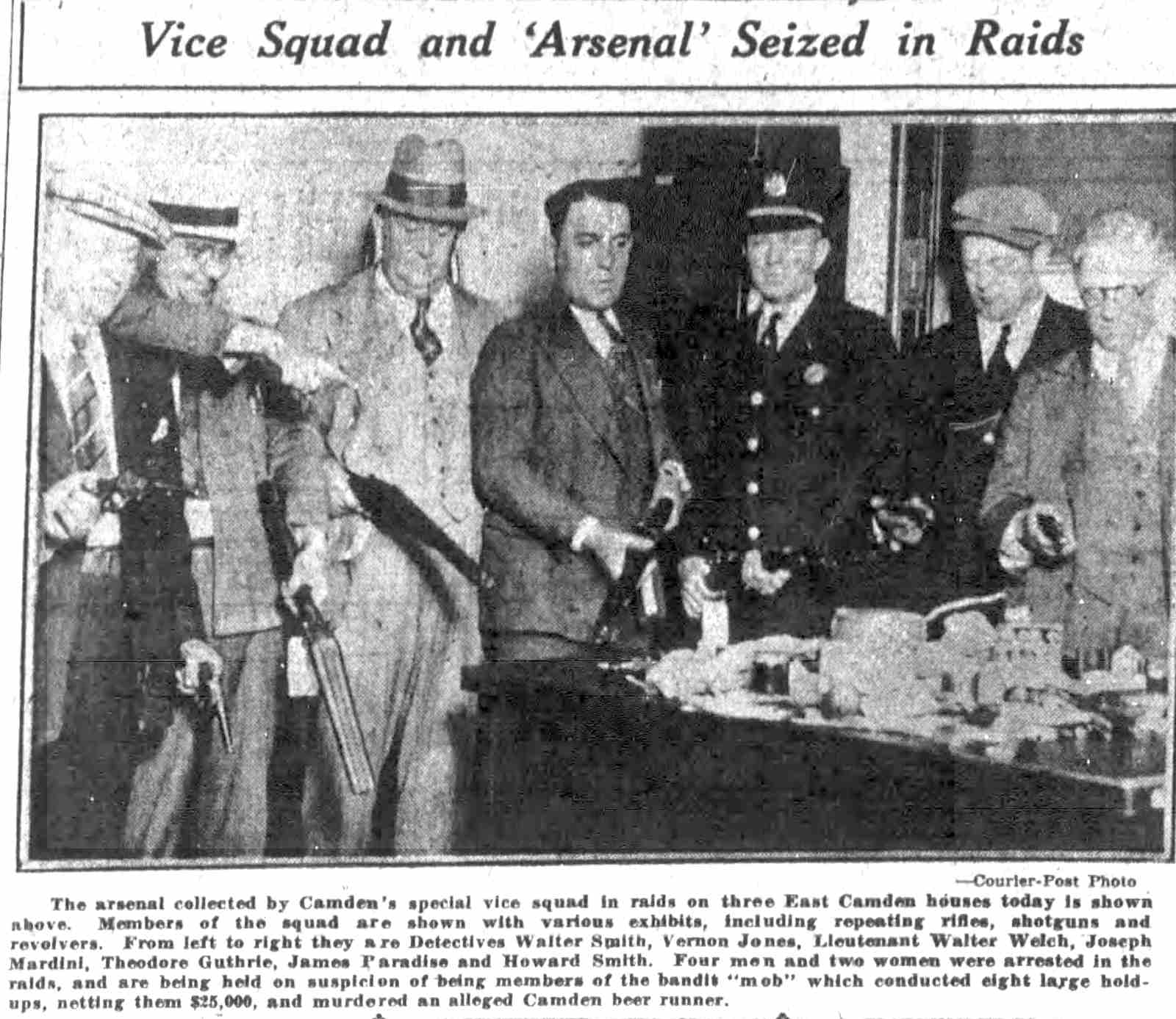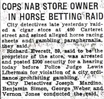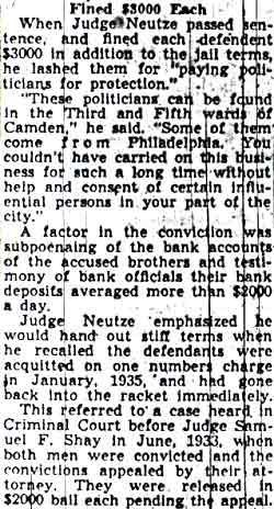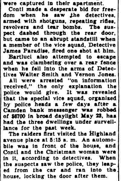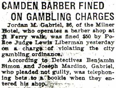 STORE RAIDED BY ‘SECRET6’ SQUAD Raiders of the “Secret 6” of the Camden police department yesterday arrested Oscar Bendler, 40, as the alleged proprietor of a cigar store at 217 Market Street, where they reported they seized horse racing sheets, three phones and $114. Bendler, who gave his address as 310 Erie Street, is charged with violating the city ordinance prohibiting gambling and is held in $500 bail for a police court hearing today. The raid on Bendler’s place was made after the police squad had searched five other small shops and found only legitimate business being conducted, Two of the shops were located on the Market Street ferry walk, two on Market Street between Second and Third Street and on Federal Street between Second and Third Street. Fine-combing of establishments were it is suspected the gambling gentry may flourish was ordered by Police Chief Arthur Colsey. The picked squad of men who operated as members of colsey's ”Secret Six” yesterday were Detective Sergeant Clifford Del Rossi, Sergeant Walter Rowand, Detectives Benjamin Simon and joseph mardino. |