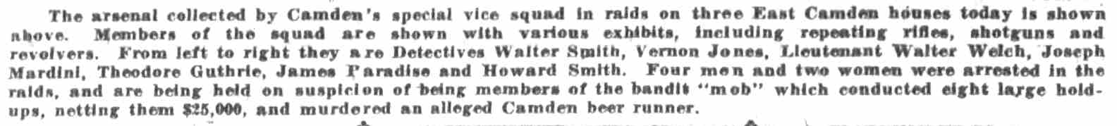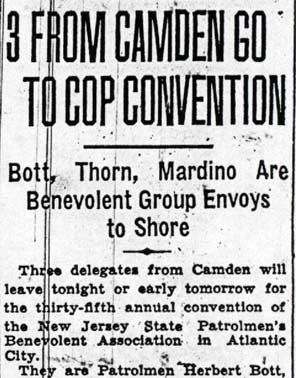 JOSEPH MARDINO was born August 13, 1899. He was the son of Italina immigrant parents, Leonardo and Angeline Mardino. By 1920 the Mardino family had moved to Camden, where they lived at 423 Cherry Street. The elder Mardino was then working in a morocco factory, that being the term for a leather process popular at the time. Joseph Mardino was still at home, and was working as an assistant foreman in another of Camden's many industries.. He married Rita Perrone at some point after the 1920 Census. A son, Leonard was born in 1924. Joseph Mardino joined the Camden Police Department on July 1, 1928. He was active in the Patrolmen's Benevolent Association, and began serving as state delegate almost as soon as he joined the force. At some point between May of 1934 and October of 1936 he was promoted to Detective, and was often partnered with veteran detective Benjamin Simon. Joseph Mardino lived at 447 Cherry Street at the time of the 1930 census, his parents and sister Lillian lived then at 423 Cherry. The 1936 New Jersey Bell telephone Directory shows him living at 443 Cherry. By 1947 he had moved to 318 Morse Street in East Camden with his wife Rita and son Leonard. He was still active with the Camden Police department as late as December of 1957. On April 3, 1954 a banquet was held at Kenney's restaurant on Market Street in honor of retiring Camden Police Department detective August Pfleiderer. Joseph Mardino chaired the committee which put the banquet together. Other members of the committee include Clifford Carr, Harry Tracy, George Ellis, Nathaniel Jones, James Mulligan, Russell Maurer, Samuel E. Johnson, Edward C. Garrity, Frank H. Ryan, James M. O'Neill, Stephen M. O'Keefe, Edward J. Quinlan and Joseph Webster.ier - Thomas McKenna Joseph Mardino still lived at 318 morse street when he passed away in February of 1979, survived by his wife and son. |