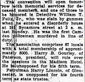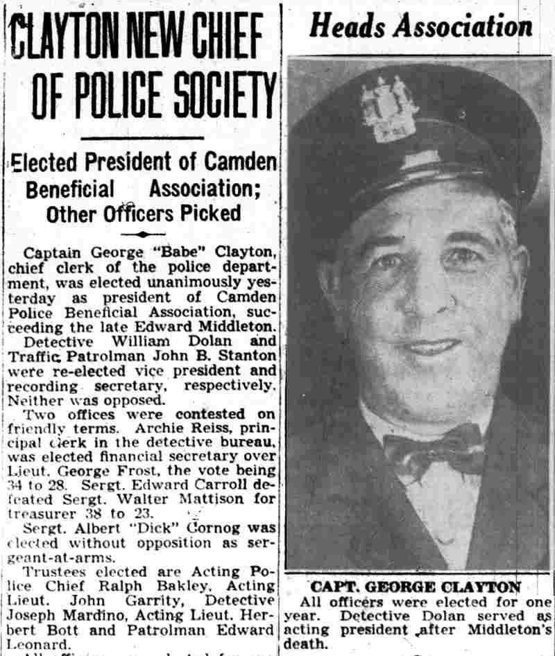 AND FIREMEN WILL ELECT TODAY The Camden Police and Firemen's Association will hold election of officers today at its headquarters, 1175 Whitman Avenue, from 1:00 PM to 9:00 PM. Herbert Bott is unopposed for re-election as president. William Thorn is unopposed to replace Richard Middleton for financial secretary and Walter Vecander is unopposed for the new post of assistant financial secretary. All these are police officers. The police trustees will be named from the following nine candidates: William Marter, George Ward, William Britner, Joseph Shreeve, William Schriber, Joseph Mardino, Joseph Dunnett, Leon Feltz and Russell Young. Two police sergeant-at-arms will be chosen from among Stanley Wirtz, Harry Cattell, Joseph Schultz and George Clayton. Three candidates are seeking the post of vice president, which goes to a fireman. They are William Spencer, Charles Edwards and albert dukes. Warren Rich , a fireman, is slated to succeed himself as recording secretary and Winfield Leviseur is unopposed for the new post of assistant recording secretary, which goes to a fireman. Four fireman trustees will be chosen from ten candidates. They are charles cook, Henry Baumgartel, walter eastlack, Arthur Batten, William Getner, William Toy, lawrence newton, James Young, Russell Anderson and William Taylor. Three firemen are seeking two posts as sergeants-at-arms. They are William Judge, John Mulligan and Furman Price. |