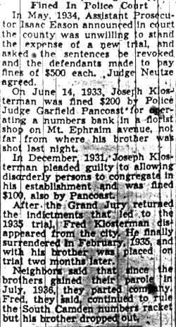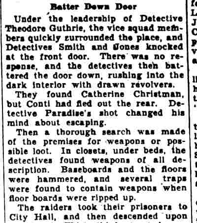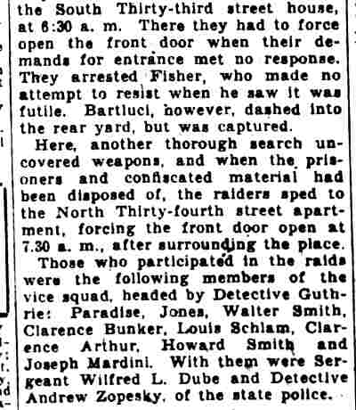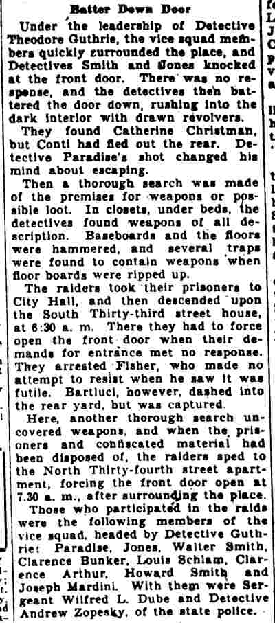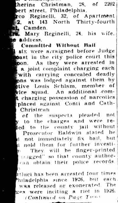 STUDENTS TAKEN IN HOUSE RAID Three Camden women and two Temple University students were arrested in a raid on an al1eged disorderly house at 1450 Kenwood Avenue last night. Charged with being proprietress of the place is Mrs. Charlotte Grimes, 4 8. She is the wife of Elmer Grimes, employed by the city as a custodian at Convention Hall and formerly custodian of the Camden High School athletic field, according to City Prosecutor John H. Reiners, Jr. The students under arrest gave their names as Sidney Goldberg, 19, of 1400 Mt. Ephraim Avenue, and Herman Katz, 19, of 2601 Wilder Street, Philadelphia. Welch Leads Raiders The arrests were made by Police Lieutenant Walter Welch and Detectives Benjamin Simon and Joseph Mardino. According to Welch, Mrs. Grimes signed a statement i n w hich she said she had resided at 1450 Kenwood Avenue for 27 years, and maintained a disorderly house there for the last seven years. He has had men watching the place for a year, to get evidence on which to base a raid, he said. He declared that only persons recommended by patrons were admitted, and then only after making telephone calls. simon , who lives three blocks from the house, and mardino saw a car with Pennsylvania license plates parked near the place last night, Welch said. They waited until they saw Goldberg and Katz leaving the house, and questioned them. It was on the strength of statements by the two youths that the raid was made, Welch added. Cases Continued The five prisoners were taken to police court today. After waiting until 10.05 for simon and mardino to appear, Welch asked that the case be continued until tomorrow. Judge Lewis Liberman set bail for $1000 for Mrs. Grimes; $500 each for the other two women, $200 for Katz and released Goldberg in the custody of his brother, an attorney. The latter said the two youths were willing to plead guilty to disorderly conduct charges, admitting they had been in the place, but Judge liberman said he preferred to wait and hear the entire case to morrow. In answer to the query by the court as to how the two knew about the existence of the disorderly house" Katz said: "Oh, things like that get broadcast around the university." |