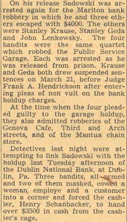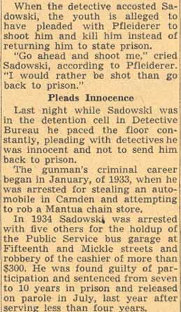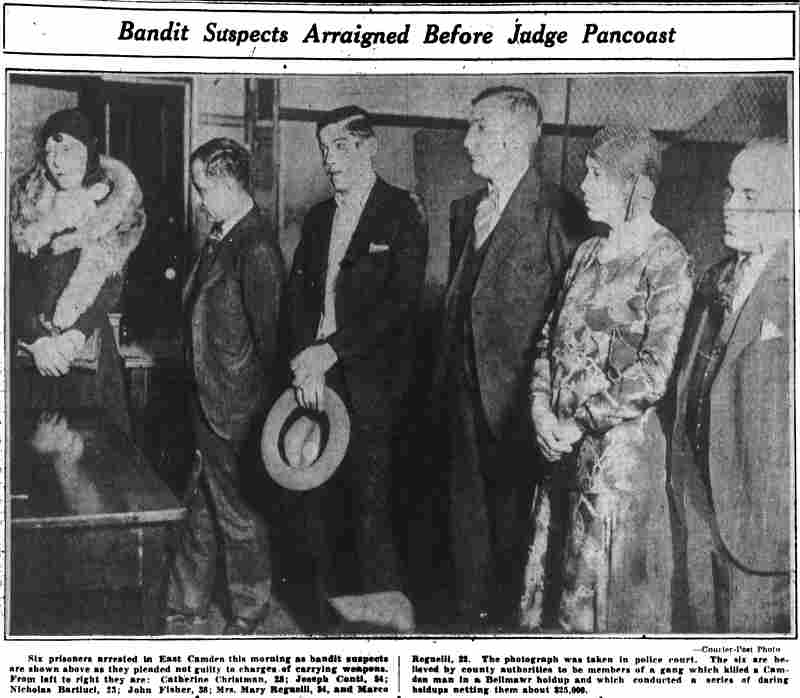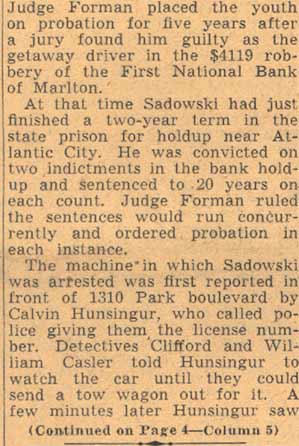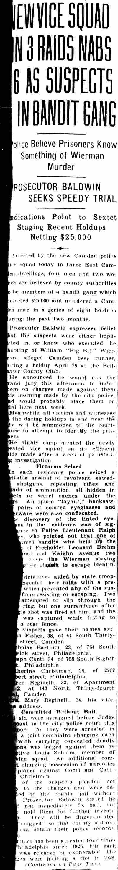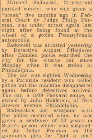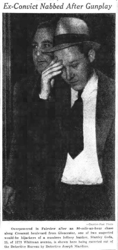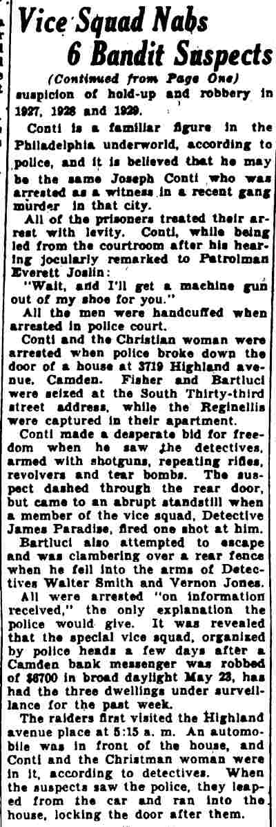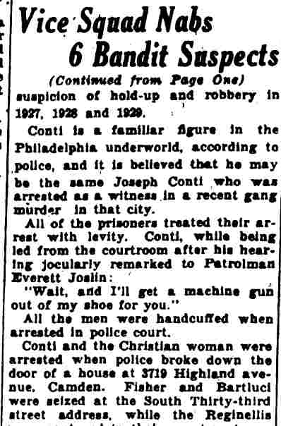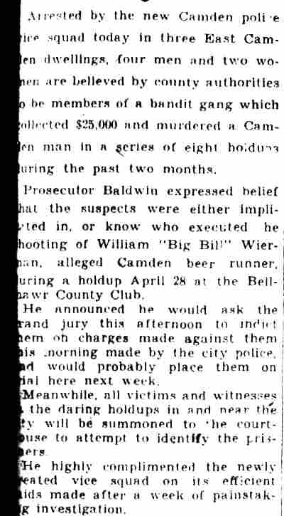 YOUTHS ARRESTED AS HOLDUP SUSPECTS Police believed they had frustrated the formation of hoodlum bandit mob yesterday with the arrest of five South Camden youths after a holdup of a grocery store at Tenth Street and Ferry Avenue. Two of the five suspects were identified by the grocer, John Jacobs, as the bandits who entered his store at 960 Ferry Avenue, held him up at gun point and escaped with $23.95. , Jacobs told Detectives Heber McCord and Clarence Arthur that he recognized one of the bandits as Anthony Mona, 19, of 947 South Third Street, a former boxer, whom he saw fighting in the ring, McCord said. A radio call was sent to all cars to pick up Mona. A short time later, District Detectives Leon Branch and John Houston arrested Mona as he was eating in a restaurant near Broadway and Kaighn Avenue. After questioning by mccord and Arthur, Mona implicated the others. They are Dominick Spinagotti, 17, of 251 Mt. Vernon street; Vito Brandimorto, 20, of 245 Chestnut Street; Salvatore Martorano, 21, of 344 Cherry Street, and Victor Labato, 19, of 274 Mt. Vernon street. Mona was searched in the detective bureau. Police found $6.65 in change in his pockets. The others were rounded up at their homes by Detective Sergeant Benjamin Simon and Detectives Joseph Mardino and Robert Ashenfelder. According to Simon the youths were "just beginning to embark on a career of crime." When the others were brought to the detective bureau for questioning, all but $2 of the loot was recovered, Detective McCord said. McCord said the youths signed statements saying Mona and Labato entered the store while the others waited in Mona's car outside the store, all fleeing together after the holdup. |
