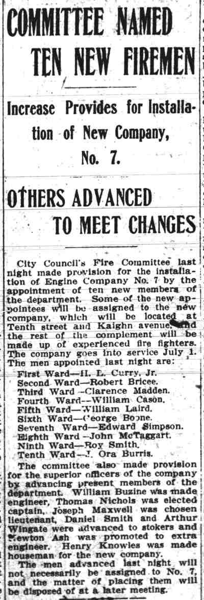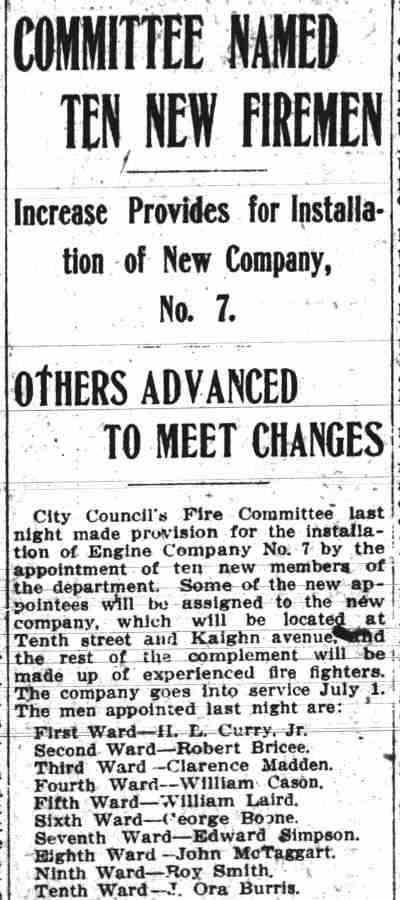 From Left: tillerman Bill Tatem, firemen Edward Finley, Charles Gladney, Harry Green; Lt. Harry Anderson; Firemen George Hollins, Steward Bakley; Captain Joseph Maxwell; driver Harry S. Burrough |