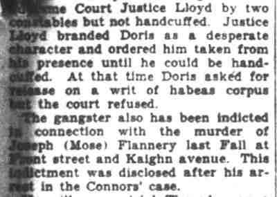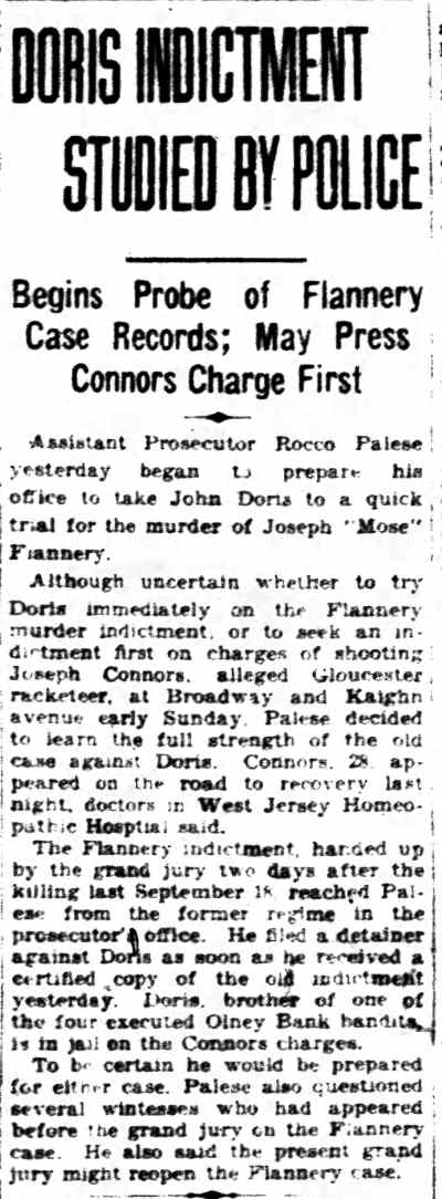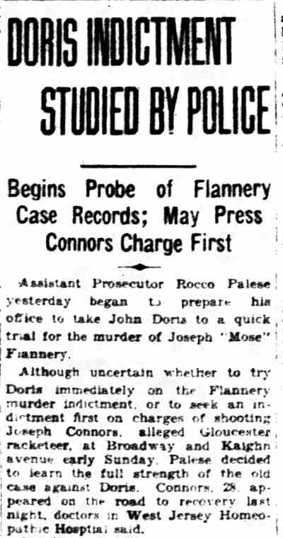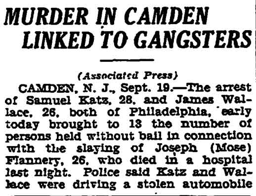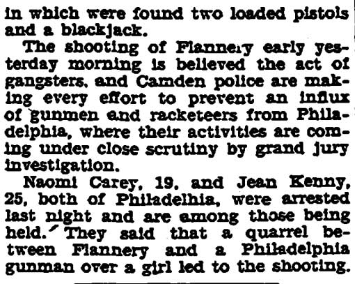 JOSEPH "MOSE" FLANNERY was born in Pennsylvania in 1902 to James A. and Mary Flannery, both of whom were born in Ireland. He was the sixth child born to the couple, coming after John F., Thomas, Winifred, Mary, and James. Two more children, Catherine and Francis, came later. When the Census was taken in 1910 the Flannerys and their eight children lived at 436 Jackson Street. From 1914 through January of 1920 the Flannery family lived at 1712 Broadway in Camden's Eighth Ward, a half block north of the corner of Broadway and Ferry Avenue. Joseph Flannery attended Camden High School as a member of the Class of 1923, but dropped out after a year or two. In 1924 he married Anna Boggs. They had a son, but the marriage was a stormy one. The couple had separated by the summer of 1928. By that time he was living at 346 Jackson Street. After World War I he became involved in organized crime in Camden and in politics in the Eighth Ward. "Mose" Flannery's involvement in politics began before he was old enough to vote. He was active as a Republican until the municipal election of 1927, when he backed the Non-Partisan slate, and aided several Democrats. During this election he came in conflict with Mikey Brown, who was the leader of the Republican party in the Eighth Ward. The two apparently mended fences after the election. "Mose" Flannery's criminal activities seem to have centered around slot machines. He was arrested several times on a variety of charges, but never convicted of any offense. In January of 1928 he was held for a time as a material witness to the murder of Joseph Cimini at the Sixth Ward Republican Club at 908 Broadway. "Mose" Flannery was mortally wounded out side the bar of James L. Hawkins at 101 Kaighn Avenue, shortly before 4:00 AM on September 18, 1928. He was taken to West Jersey Hospital, where he died that evening. Joseph "Mose" Flannery was survived by his wife Anna, his son, parents, and siblings. In the wake of Flannery's murder, the slot machine issue was brought to the forefront. When Assistant County Prosecutor Samuel P. Orlando and Camden County Chief of Detectives Lawrence Doran organized a series of raids to seize illegal slot machines, some of the raided sites had been tipped off. This would be a problem in Camden for several more years. There was political pressure on Orlando and County Prosecutor Ethan Wescott to to go easy on the slot machines, which did not help the situation. There would be problems of this nature within Camden's police department for several more years. Camden Commissioner and Director of Public Safety Dr. David S. Rhone received criticism for the situation, as did Chief of Police Lewis W. Stehr. There would be several shakeups within Camden's police department for several more years, due to problems of this nature. In April of 1929, John Doris, while being arraigned for shooting Joe O'Connor, was also charged with the murder of "Mose" Flannery. He had been indicted on September 20, 1928 but the indictment was kept secret, as Doris was a fugitive at that time. John Doris never stood trial for the Flannery murder. He was serving time at Trenton State Prison for the wounding of O'Connor when he was stabbed to death by another inmate in 1930. John Doris' murder was never solved. |