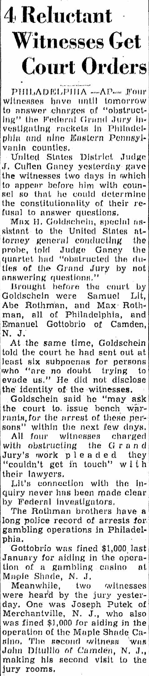 JURY CLEARS NUMBER SUSPECTS Two men alleged by city and county authorities to have succeeded the Klosterman brother sin controlling the Camden numbers racket last Spring, were exonerated by the Camden county grand jury. Those whose cases were “no billed” are Chester “Gassy” Szalinski, 30, of 1188 Chestnut Street, and Joseph Putek, 29, of 2955 Tuckahoe Road. At the same time, the grand jury in its report to the County Clerk Charles S. Wise, failed to find an indictment against Robert Bloodworth, another suspect arrested in connection with the operation of lotteries in Camden. After the trial of the Klosterman brothers, Fred and Joe, both of whom were convicted last spring of number charges, Szalinski was named by Police Chief Arthur Colsey as the “Sixty-ninth Street mobster who had taken over the Klosterman numbers play.” Every policeman in Camden was ordered to arrest Szalinski on sight. The suspected numbers operator was arrested and later released in $1500 bail to await the action of the grand jury. Putek was arrested lat April after police had engaged in a sensational chase of 15 blocks after a suspected numbers pickup automobile at which they fired a number of shots, pone of which struck a bystander. Police allege putek joined szalinski in control of the Klosterman numbers game. Arrests of both men climaxed orders to county police authorities by Supreme Court Justice Frank T. Lloyd and Prosecutor Samuel P. Orlando to clean up the number racket in this area. “No bills” were returned by the grand jury for Harry Hartman and John Burke charged with attempts and breaking and entry; J.G. Flynn, accused of being a fugitive from justice from Philadelphia; Ralph Latshaw, Anna Green, and Theodore Jones, statutory charges. Hartman and Burke were held for the grand jury last month on charges they attempted to enter the saloon of Mrs. Mamie Piraine, Republican county committeewoman from the Eighth Ward, at 1944 Broadway. |