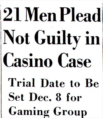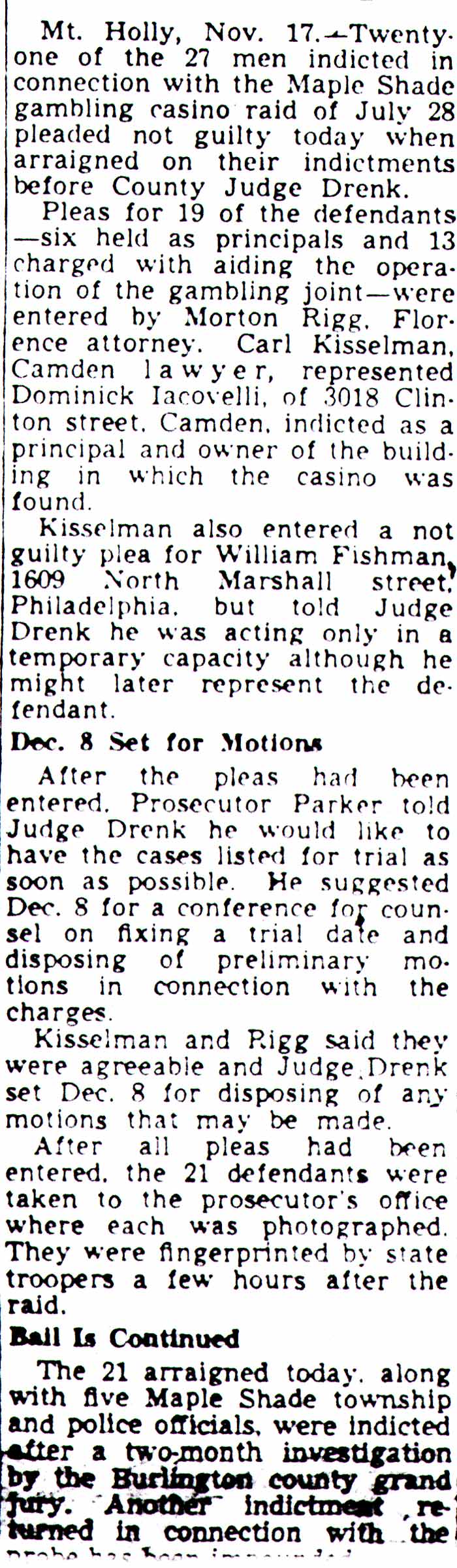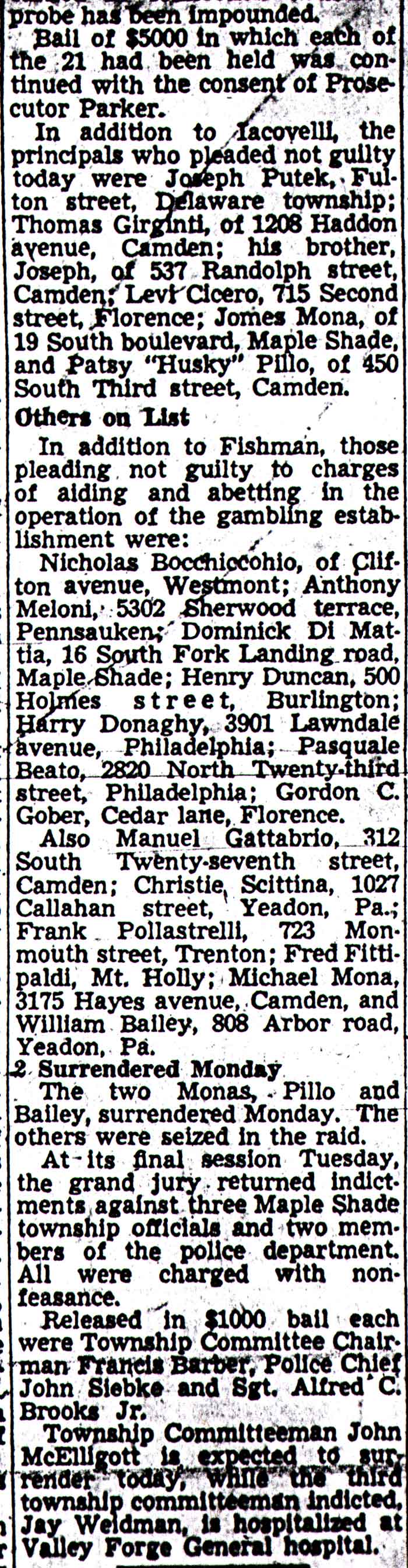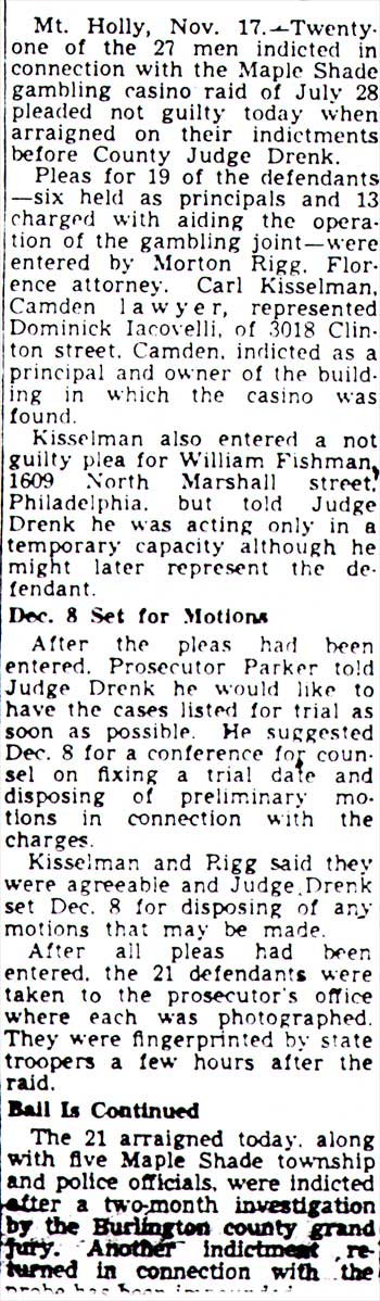 Confiscate $38,700, 187 Men Are Nabbed Gamblers Felt Secure As They Thought Raid Wasn't Possible; Race Wires Are Being Traced By Police LAND FOR BUILDING SOLD BY TOWNSHIP Maple Shade's so-called "plumbing warehouse" proved to be just what residents suspected it to be- an elaborate gambling establishment. New Jersey state troopers from North Jersey smashed their way into the thriving gambling house early Thursday morning at Fellowship road and State Highway Route S-41, arrested 187 men, and confiscated more then $40,000 in cash. Two revolvers and a clip of ten loaded cartridges for a carbine were seized in the surprise swoop. About twenty of those arrested were taken into custody when they arrived at the jam packed establishment unaware that the police had moved in. Thirty men were questioned as suspected operators, lookouts, card dealers and dice "stick men," and 19 of them were eventually held as "principals." All the others were given a prompt hearing before a judge in Maple Shade, and were released after depositing $25 cash bail. Most of them said they were from Camden or Philadelphia. The raid, described by its leaders as one of the biggest ever staged in South Jersey was executed at 12:50 a.m. by eight uniformed troopers and nine plain clothesmen acting under special orders from Colonel Charles H. Schaeffel, head of the state police. Eight additional uniformed men were called in later from barracks at Columbus, Berlin, and Riverton. Maple Shade Police and township officials were not notified of the raid until after it had taken place. It was one of the biggest gambling raids ever staged in New Jersey. The target was a one-story cinder brick structure, resembling a garage or warehouse, nestled in a clearing surrounded by thick woods not far from intersections of Route S-41 and Fellowship road. A narrow country lane, located about 150 feet off Fellowship road, served as the entrance. Police said that many patrons had been taken to the gambling house by "luggers" operating limousine service from Philadelphia, and from other places within a radius of about 60 miles. The ground for the building was sold to Domenic Iacovelli at public sale by the Maple Shade Township Committee on April 26 with Thomas Vogdes, Main Street real estate agent, acting as agent for Iacovelli. On July 12, Iacovelli bought another piece of land adjoining the first parcel from the township. An investigation today revealed that the township has no record of Iacovelli's address although it is believed he resides in Camden. It is reported that the building was erected in 17 days with workmen working 24 hours a day. Some local men worked on the erection of the building. The raiding party was led by Captain Arthur Keaton and Emerson Tschupp, deputy director of the New Jersey Alcoholic Beverage Control Commission. The magnitude of the raid was such that it was more then eight hours after the troopers struck the gambling joint at 1 a.m. until the last of those seized had been booked at the Maple Shade police station. Fourteen of those arrested were held in $5,000 bail each as principals by Municipal Judge Bowers of Cinnaminson township; four were held in bail of $1,000 each as material witnesses and one held in $2,000 bail as a material witness. The 14 men booked as principals on charges of aiding, abetting and assisting in the operation of a gambling establishment were: Nicholas Bocchicchio, of Clifton avenue, Westmont, identified by Keaton as a brother of Felix Bocchicchio, who is manager of heavyweight Jersey Joe Walcott. Levi Cicero, 715 Second street, Florence. Pasquale Beato, 2820 North Twenty-third street, Philadelphia. Thomas Girgenti, 1208 Haddon avenue, Camden. Henry Duncan, 600 Holmes street, Burlington. Gardon C. Gober, Cedar lane, Florence. Christie Scittina, 1207 Callahan street, Yeadon, Pa. Dominick Di Mattia, 16 South Forklanding road, Maple Shade. Joseph Putek, Fulton street, Delaware township. Anthony Meloni, 5302 Sherwood Terrace, Pennsauken. Manuel Gattabrio, 312 South Twenty-seventh street, Camden. Harry Donaphy, 3901 Lawndale avenue, Philadelphia. Frank Pollastrelli, 723 Monmouth street, Trenton. Bail was posted for Girgenti by N. Morton Rigg, a Burlington attorney. Complaints against the suspects were signed by State Police Lt. Clinton J. Campbell, Columbus barracks. The other 166 seized were booked as disorderly persons and were released in $25 cash bail each for a hearing August 17. Captain Keaton, who led state troopers last Tuesday in raiding the national headquarters of a $50,000,000 lottery ring in New York, said he recognized henchmen of Marco Reginelli among men seized. After undergoing questioning in the gambling establishment for more then three hours, the patrons were transported in one of Fred Olt's buses to the Maple Shade police station. The station became so crowded it was necessary to use the auditorium of the municipal building to book the men. Lookouts Sound AlarmThe raiding party, in addition to Captain Keaton and Tschupp, included eight uninformed troopers in charge of Lt. Albert G. Varrelman, and nine in plain clothes. They reached the place at exactly 1 a.m. Lookouts stationed in a cupola-like arrangement in front of the building, immediately detected them and alarm buzzers were heard sounding inside the 100-foot long building. Previous inspection of the exterior of the building, it was learned from the troopers, indicated there were only two exits, the four-foot wide door in front and another the same size at the rear. As they pulled into the ground one trooper drove his car to the rear and blocked the door. Others, carrying 20-pound sledge hammers, attacked the front door, later found to be lined with armor plate, but could not batter it down. Spotlights on the troopers' cars were turned on the front of the building and revealed a window, about six by 12 inches, to one side. Working from the top of one of the cars, the troopers smashed away at this until a hole was made large