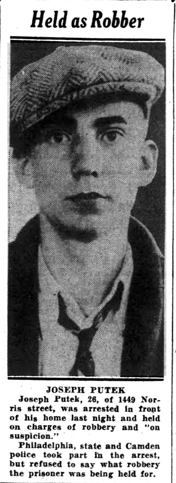 HELD The $11,790 payroll holdup staged last Friday at the Radio Condenser Co., Thorne and copewood streets, was, re-enacted yesterday. Two suspects nabbed late Monday, at Lykens in Dauphin County, Pa., played the "heavy" roles. Also in the cast were eight women and two men, employees of the firm. For an hour and 20 minutes the spectacular robbery was "rehearsed" under the direction of three Camden detectives. When the curtain was, rung down LeRoy Jenkins, 23, who police say has addresses at 1161 Mechanic Street and 1220 Princess Avenue, and Joseph Putek, 23, said to reside at 1462 Louis street, were held on suspicion. They will be questioned further today. Has Nothing Definite Acting Chief of Police John W. Golden admitted he "has nothing on the boys." Detectives Benjamin Simon, clarence arthur and Clifford Del Rossi, however, "were pressing pursuit of "hunches" and meager clues in attempts to solve the crime. There were several lines of information they obtained regarding the two suspects which will bear further study, simon said. Putek, who has a po1ice record although never convicted according to police, was questioned previously in connection with the Radio Condenser "job." He was released at midnight last Saturday. After that the detectives centered attention upon Jenkins. They learned Jenkins borrowed an automobile from a man who operates a garage in the 1200 block on Atlantic Avenue. The garageman was reluctant to talk but under threat of arrest as an accessory he admitted lending a car to Jenkins. Fliers were dispatched to police throughout Pennsylvania, New York, Delaware and New Jersey. The car was halted at Williamsport, Pa. and when Camden police were identified they were surprised that Putak was Jenkins' companion. This stirred detectives to renewed vigor in the probe. They learned the men were planning to visit relatives, of Jenkins in Williamsport and Pottsville. According to simon police of both cities say Jenkins is well known to them. While at Williamsport the three detectives learned Putek and Jenkins visited a vice den and quarreled with a woman over money. They quoted Jenkins as declaring that he "could buy and sell the joint!' Had Little Money Putek had but $3 when released Saturday and $11 when arrested, si mon revealed. He told the detectives he had won money in a poker game here. The two men were returned with the detectives as far as Philadelphia but refused to cross the river. They were turned over to police there on suspicion and. brought to this city yesterday afternoon. Taken to the Radio Condenser plant they were confronted with the ten employees who were herded in a vault during the holdup last Friday. According to si mon several of the employees felt there were certain mannerisms of the suspects which corresponded with actions of the bandits but confessed they were unable to definitely identify Putek or Jenkins as the heavily masked pair who threatened their lives with a revolver and shotgun. . The detectives propose an inquiry to al1 banks in this area in an ef fort to learn whether safe deposit boxes were leased by anyone answering the description of the suspects. The money obtained in the robbery was in bills and change of small de nomination, numbers of the bills were not available. Although never convicted Jenkins has a police record. Putek has never been formally under arrest, but has been questioned by the police in connection with various cases. Jenkins was arrested December 18, 1931, charged with larceny of gaso line, and on last July 9 was charged with several robberies. On April 2, 1931, he was held for the grand jury, charged with man slaughter after his automobile killed Mrs. Mary Cavanaugh, 70, a cook in the service of City Solicitor e. G. C. Bleakly. |