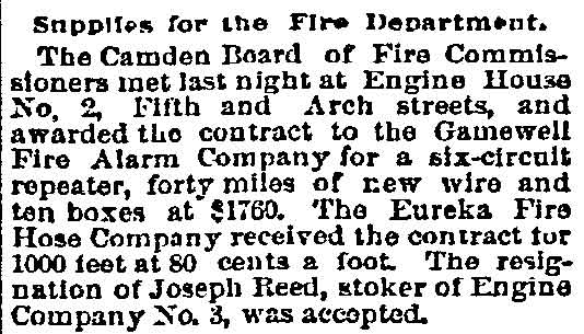 Joseph Reed was appointed to the Camden Fire Department around 1886. City Directories show him living at 1745 Fillmore Street in 1887. Fire Department records and the 1888-1889 City Directory give his address as 1707 Fillmore Street. Joseph Reed served with Engine Company 1. When the decision was made to place a new engine company in service in Joseph Reed's neighborhood, he was selected to be one of its charter members. On June 1, 1890 Engine Company 3 of the Camden Fire Department went into service in its newly build firehouse at 1813 Broadway. When first organized, Engine Company 3 consisted of a Foreman, an Engineer, a Driver, and two hosemen. The first members of Engine Company 3 are as follows.