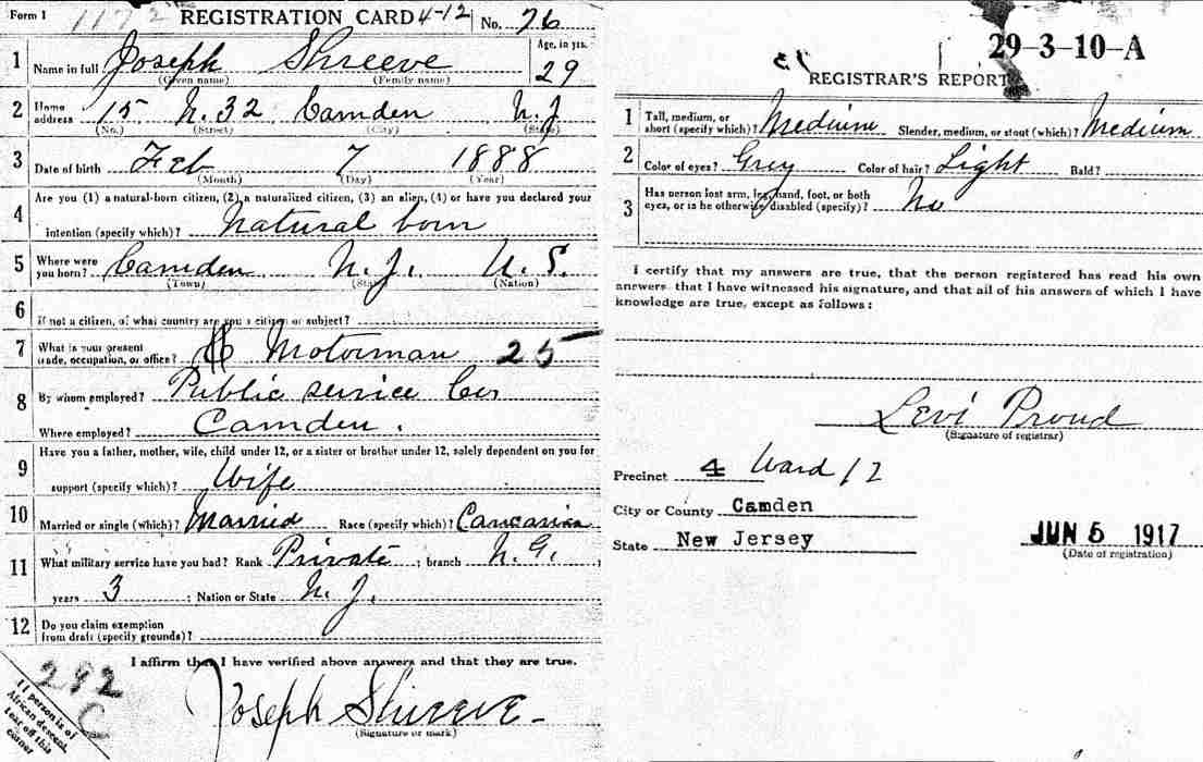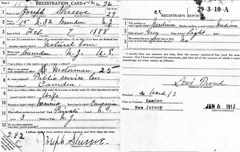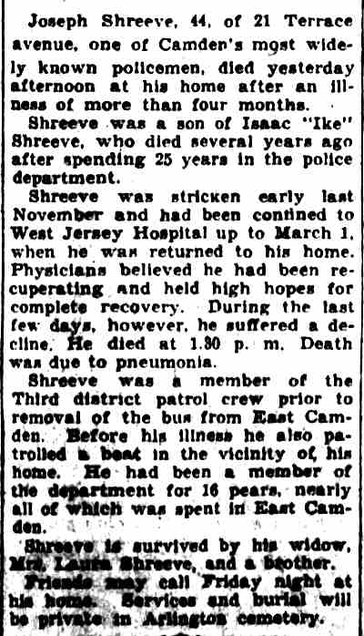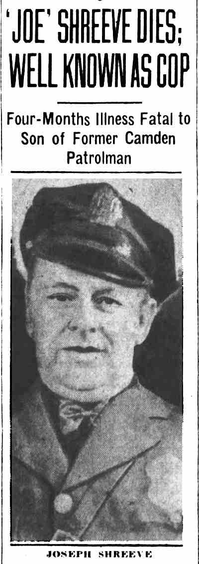 JOSEPH SHREEVE was the son of Isaac Shreeve, who worked as a firefighter and policeman for over 42 years. Joseph Shreeve was born in Camden, New Jersey on February 7, 1888. He married Laura Boulton around 1914. Her uncle, Edgar Boulton, was then serving with the Camden Police Department. Her brother, Lawrence Boulton, would later be appointed to the Camden Fire Department. Joseph Shreeve had already served three years as a private in the New Jersey National Guard prior to registering for the draft on June 5, 1917. He was then working as a motorman, driving a trolley car for the Public Service Company. Despite his prior military service, Joseph Shreeve was not called up. By December of 1919 he had followed his father into the police department. The 1930 Census shows Joseph and Laura Shreeve living at 21 Terrace Avenue in East Camden, with Laura's parents, Charles S. & Annie Boulton. Joseph Shreeve died in 1935 at the Terrace Avenue home after an illness of four months. He was survived by his wife Laura and a brother. There had been no children. Joseph Shreeve was buried at Arlington Cemetery in Pennsauken. |