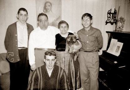 "Me, Uncle Joe, after he retired from the sanitation department in Camden, Aunt Anne who worked at the Metro Donut Shop, My cousin Ken who is an art professor at the Maryland Institute of Art, and in front my Cousin William who is a gym teacher in Camden. Picture taken in 1959 at my parents house in the Fairview section of Camden." |