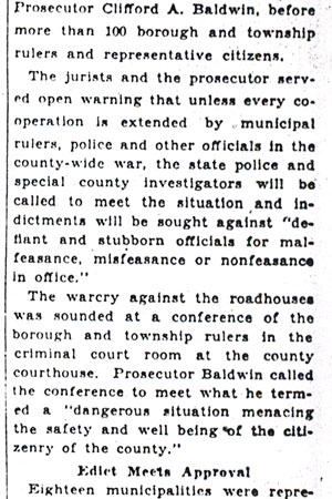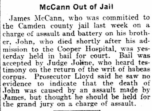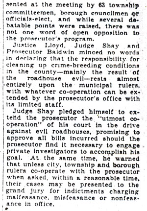 JURY CLEARS NUMBER SUSPECTS Two men alleged by city and county authorities to have succeeded the Klosterman brother sin controlling the Camden numbers racket last Spring, were exonerated by the Camden county grand jury. Those whose cases were “no billed” are Chester “Gassy” Szalinski, 30, of 1188 Chestnut Street, and Joseph Putek, 29, of 2955 Tuckahoe Road. At the same time, the grand jury in its report to the County Clerk Charles S. Wise, failed to find an indictment against Robert Bloodworth, another suspect arrested in connection with the operation of lotteries in Camden. After the trial of the Klosterman brothers, Fred and Joe, both of whom were convicted last spring of number charges, Szalinski was named by Police Chief Arthur Colsey as the “Sixty-ninth Street mobster who had taken over the Klosterman numbers play.” Every policeman in Camden was ordered to arrest Szalinski on sight. The suspected numbers operator was arrested and later released in $1500 bail to await the action of the grand jury. Putek was arrested last April after police had engaged in a sensational chase of 15 blocks after a suspected numbers pickup automobile at which they fired a number of shots, pone of which struck a bystander. Police allege Putek joined Szalinski in control of the Klosterman numbers game. Arrests of both men climaxed orders to county police authorities by Supreme Court Justice Frank T. Lloyd and Prosecutor Samuel P. Orlando to clean up the number racket in this area. “No bills” were returned by the grand jury for Harry Hartman and John Burke charged with attempts and breaking and entry; J.G. Flynn, accused of being a fugitive from justice from Philadelphia; Ralph Latshaw, Anna Green, and Theodore Jones, statutory charges. Hartman and Burke were held for the grand jury last month on charges they attempted to enter the saloon of Mrs. Mamie Piraine, Republican county committeewoman from the Eighth Ward, at 1944 Broadway. |