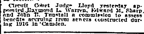 PICKS PORTER TO SUCCEED LLOYD Trenton, January 31- Governor Moore today nominated Circuit Court Judge Newton H. Porter, now sitting in Essex: county, to the state Supreme Court seat left vacant by the retirement of Justice Frank T. Lloyd, of Merchantville. The nomination is now before the Senate for confirmation. The naming of Porter, a Republican, was a distinct surprise. Circuit Judge V. Claude Palmer, of Burlington county and also a Republican, was believed to have had the inside track for the court vacancy. J. Warren Leyden, of Hackensack, was nominated as circuit judge to succeed Judge Porter. The nomination of Porter, marks the fourth time he has been, appointed to the bench by a Democratic Governor and the third, time by Moore. He first was named to the Essex County Common Pleas Court in 1924 by Gov. George H. Silzer. Moore appointed him to the Circuit Court in 1926 and reappointed him during the second Moore administration. Porter's appointment maintains the five to four Republican majority on the Supreme Court. When Moore first 'took office, it was reported that he would name a Democrat to reverse the balance, but later it was understood that the seat would go to a Republican. The terms of Chief Justice Brogan and Chancellor Campbell, both Democrats, expire during Moore's present administration and it was understood that the Democrats felt that by appointing a G. O. P. man to the Lloyd vacancy they could forestall any criticism of continuing two of their own party in the highest judicial posts in the state. Porter is a resident of Montclair. He was born in Somerville, April 13, 1877, and moved with his parents to Newark in 1885. At the age of 12 he went to work in the Newark office of the Bureau of Internal Revenue, where he remained until January 1, 1910. Meanwhile, he went to school at night and in 1902 was graduated from the New York University's evening law school. He was admitted to the New Jersey bar as an attorney in 1904 and as a counselor in 1907. From 1910 until his appointment to Common Pleas Court he practiced law in Newark. Legislative correspondents here re called Porter as a capable attorney who took part in a number of public hearings on bills. He usually represented liquor interests in hearings on measures governing that industry. The Supreme Court appointment is for seven years and pays $18,000 annually. Justice Lloyd ended his term last Saturday and chose to retire at $9000 a year, thus causing the vacancy. Justice Donges, now sitting in the Atlantic, Cape May, Cumberland and Salem counties district, is expected to take over Lloyd's old district of Camden and Gloucester counties, while Justice Perskie may move down from the Burlington, Monmouth and Ocean counties .district to the so-called "Shore Circuit" vacated by Donges. Justices select their own districts according to seniority and usually chose one near their residence. Since Donges lives in Camden he is expected to choose Camden and Gloucester. Perskie's home is in Atlantic City, and it is believed he will take over the shore district. This will leave the Burlington, Monmouth and Ocean circuit open for Porter, provided some other justice does not choose it. Porter's appointment apparently dashed the hopes of South Jersey Democrats that they might get a judgeship out of the Supreme Court shift. They had anticipated that if Palmer, who had the backing of Senator Powell and other Hoffmanite Republicans, were named to the Supreme Court, some local Democrat would take Palmer's place on Circuit. With Porter being appointed, however, his successor on the Circuit bench probably will be Grossman or some other North Jersey man. Reilly, for 27 years connected with the Federal Trust Company, Newark, and now treasurer of the institution, is best known politically since the inauguration of President Roosevelt for his work in connection with the Birthday Ball committee. He has been treasurer of the committee in Essex county each year, and served in a like capacity for the Jackson Day Dinner committees. He is a member of the American Institute of Banking. In addition to his post with the Federal Trust, Reilly is president of the North Newark and secretary of the Newark 21 Building and Loan Associations. He never before has held public office. In his youth Reilly was well known as a professional basketball player. Later, he enlisted in the Navy during the World War. He never married.. |
