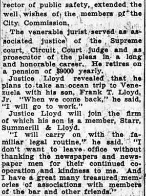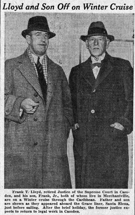 Supreme Court Justice Frank T. Lloyd is not given to rendering judicial decisions without considerable time and thought. He can make quick decisions, however, and act on them just as quickly. He did so Wednesday night and the fact it didn't work was no fault of his. With his wife and son Frank T. Jr., the jurist was dining at his home In Merchantville when the family suddenly recalled the next day was the birthday of his daughter, Mrs. Robert S. Davis, of San Pedro, California. The three decided they would telephone Mrs. Davis their congratulations. About that time, the Lloyd phone ring. It was Mrs. Davis to express regrets her parents, and brothers could not attend the birthday dinner she was giving the next night. Goodbyes were said and Justice Lloyd returned to his library. "Can't attend!” he mused. "H'mmm, we'll see about that." Quietly arrangements were made and at 12:30 a.m. yesterday, the Lloyds were aboard a plane from Central Airport, and were scheduled to arrive in Los Angles about 5:00 p. m. Within an hour after that, they would be in the home of Mrs. Davis. But the jurist reckoned without the perversity of the weather man. Two hours after the take-off here, the plane was grounded at Pittsburgh because of snow- lots of snow and more promised. There the Lloyds were placed aboard a train and reached St. Louis at 3 o'clock. A few hours later they were in Kansas City and there they must stay until sometime today, when, it is hoped, weather conditions will permit them to resume the flight. They didn't get to attend Mrs. Davis' birthday party, but they plan a short visit with her and returning by boat, are expected back home March 3. |