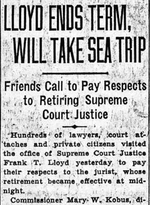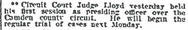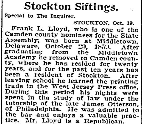 FRANK T. LLOYD was born in Middletown, Delaware on October 29, 1859, to Horatio and Caroline Lloyd. He was one of at least four children. He received his education and was graduated from the Middletown Academy. In 1875 he moved to Camden and became a compositor. The 1880 census shows the Lloyd family at 578 Clinton Street in Camden NJ. That block of Clinton Street, still standing today, was a series of row homes. On either side of the Lloyd family lived John Warnock at 576 and E.L. Senseman and 580. Both were printers, and Frank T. Lloyd was in 1890 working as a printer as well. At 582 Clinton Street lived Professor Horatio Draper, who had a long and distinguished career in the Camden School system. It is likely that Professor Draper influenced young Lloyd to further his education.. While serving his apprenticeship as a compositor he studied law in the office of Judge James Otterson, of Philadelphia. He was admitted to the bar of Pennsylvania in 1882 and practiced in the Philadelphia courts 15 years. He was elected to the Assembly from Camden county in 1896, and admitted to the New Jersey bar in 1897, was also re-elected to the Assembly that year. On March 24, 1899 he introduced a bill into the Assembly which enabled the Town of Stockton to be annexed by the City of Camden, bringing present-day East Camden and Cramer Hill into the city. In 1900 he became a counselor-at-law and the same year was appointed prosecutor of Camden County when both the current prosecutor, Wilson Jenkins, and his assistant, William Carson, died unexpectedly. Frank Lloyd married about 1887, and with wife Mary, had at least one child, a son, Frank T. Lloyd Jr., born in 1894. The Lloyds appearsin the 1888-1889 and 1890-1891 Camden City Directories as living at "4th near State" in the Pavonia section of Stockton Township, now known as Cramer Hill. In the late 1890s he resided at what is now North 18th Street and River Avenue in the Town of Stockton. This home was later converted into an orphanage. By 1910 Frank T. Lloyd and family were was living at 527Cooper Street, next door to businessman and local historian Charles S. Boyer. The two would remain friends until Boyer's death in November of 1936. Frank T. Lloyd was appointed to the Circuit bench in 1906 by then Governor Edward C. Stokes. He was re-appointed by Governor George S. Fielder in 1914 and Governor Edward I. Edwards in 1921. He was named to the New Jersey State Supreme Court in 1924 and re-appointed in 1931. During his tenure on the Supreme Court, Judge Lloyd was an active opponent of organized crime and public corruption. During the World War I, Judge Lloyd and County Prosecutor Charles A, Wolverton served as Federal Food Administrators for Camden County. At the time of the 1930 census, Justice and Mrs. Lloyd were living at 6507 Maple Avenue, the corner of Maple and Cove Road, in Pennsauken NJ. Justice Lloyd retired from the New Jersey State Supreme Court post in January of 1938 and returned to private practice. Justice Frank T. Lloyd passed away in 1951. |